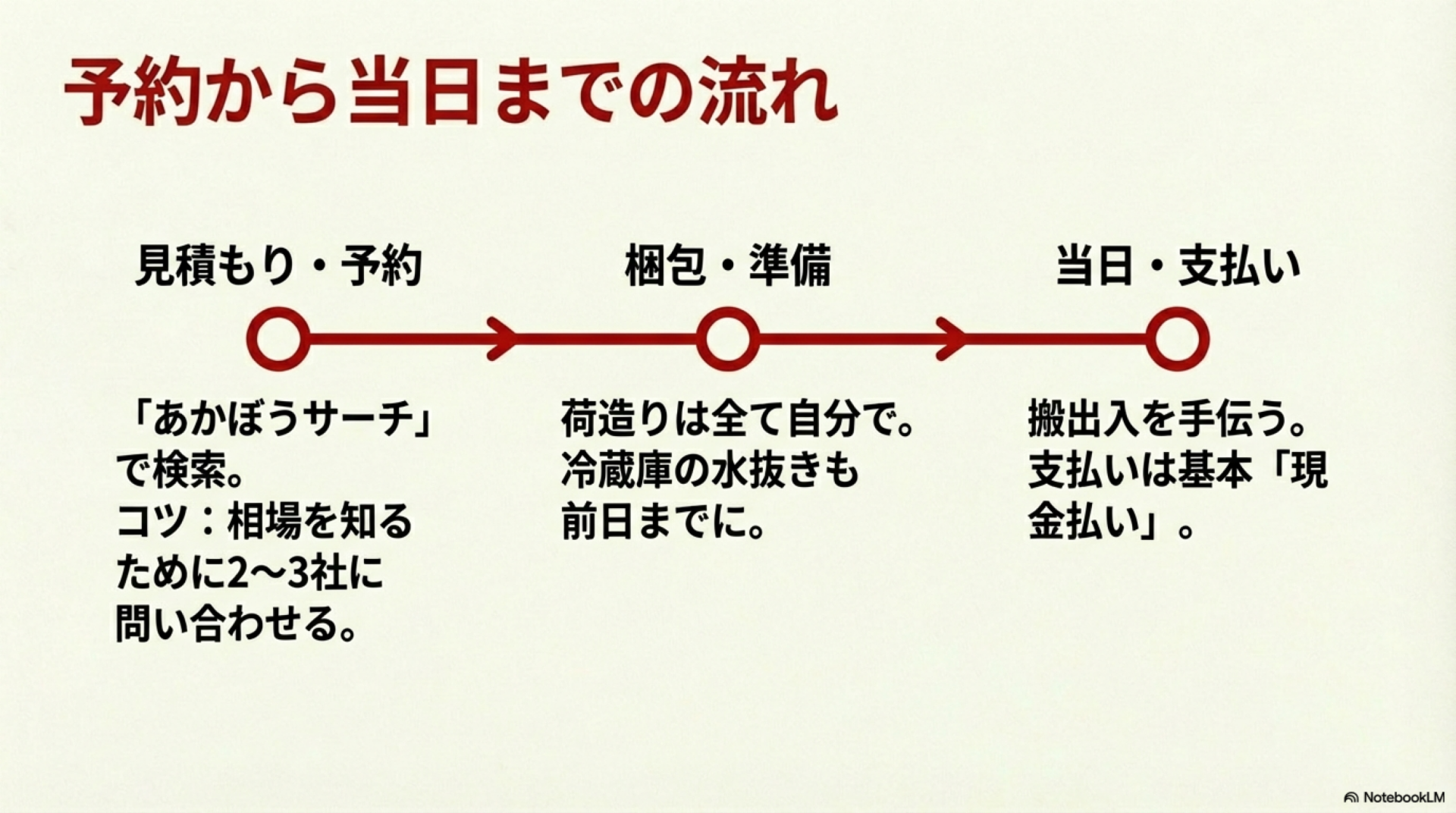 • 貴重品は自分で管理:現金・通帳・印鑑・宝石類は運搬対象外。自分で運ぶ