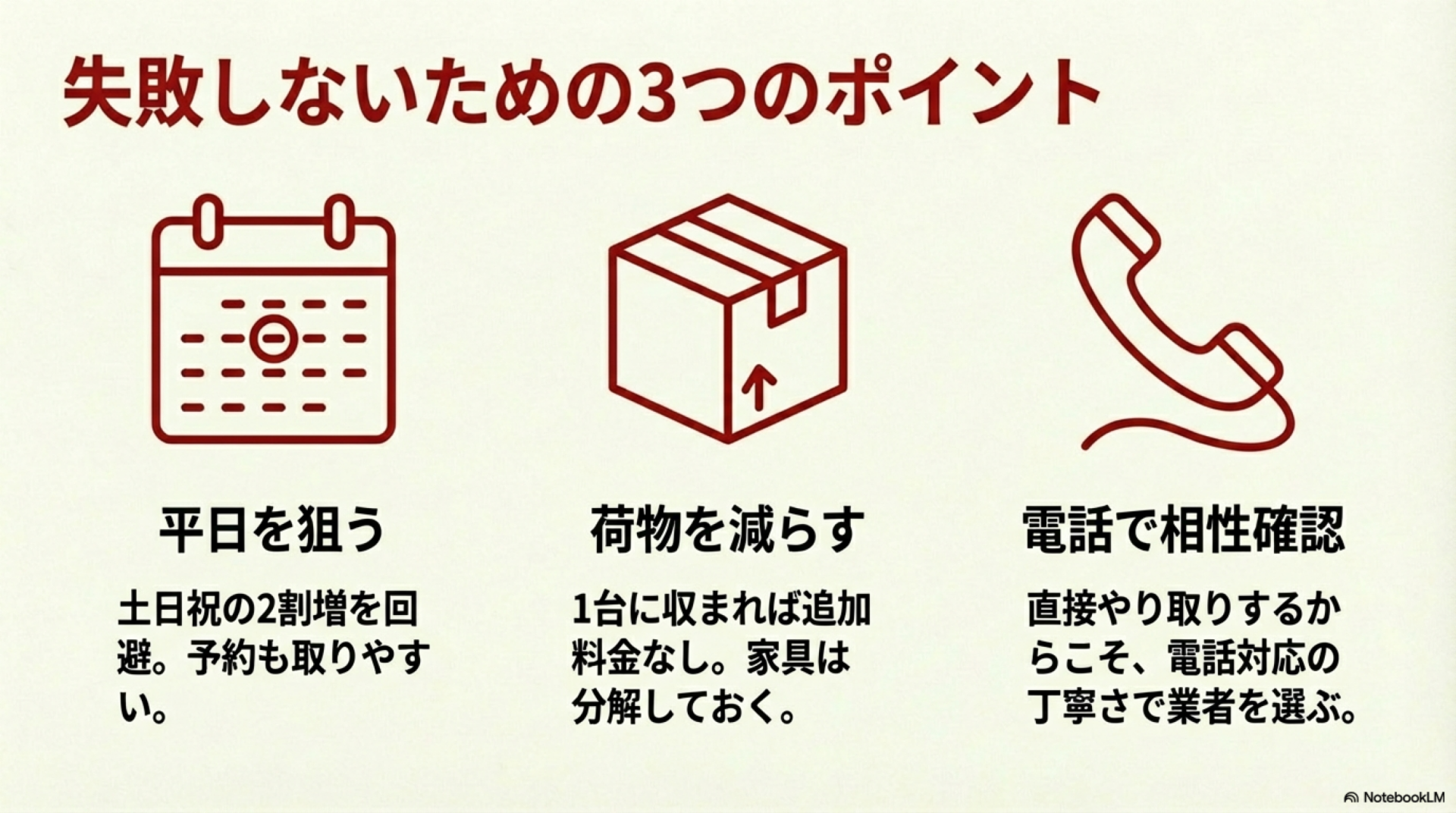 • 荷物量を事前に減らす:1台に収まれば追加台数分の料金が不要。不要品は事前に処分し、大型家具は分解しておく
