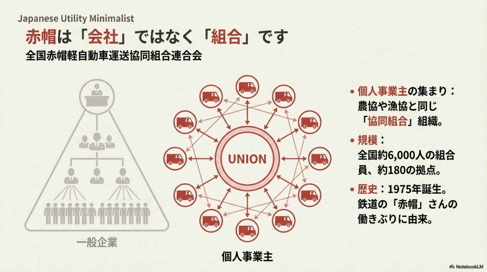 赤帽は、軽貨物自動車運送事業を営む個人事業主が集まって組織した協同組合です。農家が組織する農業協同組合(農協)や、漁師が組織する漁業協同組合(漁協)と同じ仕組みで、国土交通省から認可を受けた唯一の全国組織として活動しています。