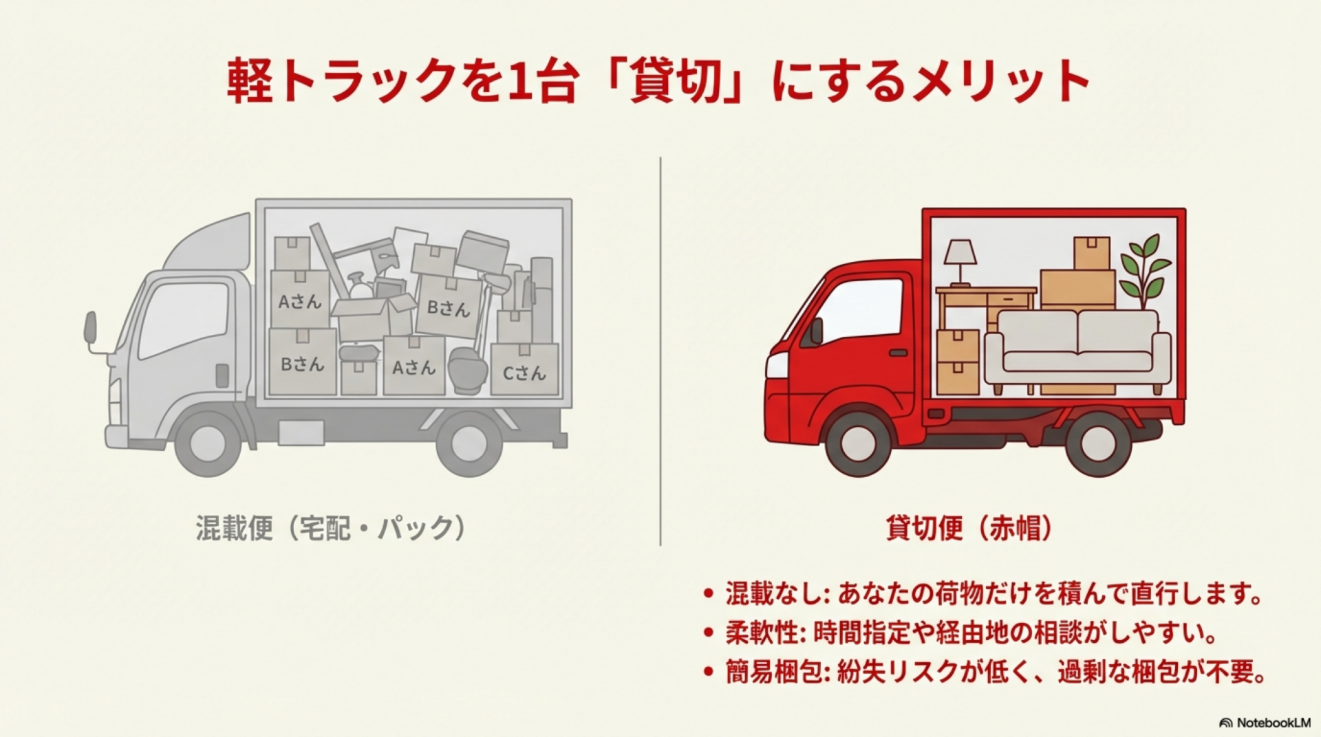 • きめ細かい個別対応:ドライバーと直接やり取りするため、配送時間の細かな調整や特殊な搬入経路への対応など融通が利きやすい
