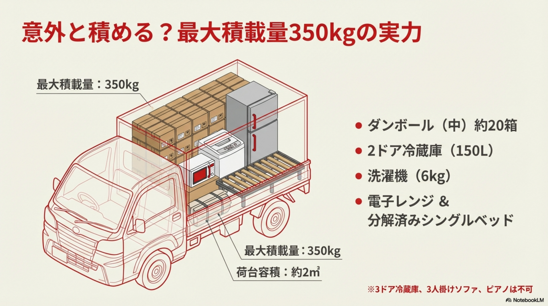 1K〜1DKの単身者で、大型家具・家電が少なければ1台に収まるケースが多いです。ただし、3ドア以上の大型冷蔵庫(400L超)、3人掛けソファ、ピアノなどは物理的に積載できないか、積載量を超えるため運搬できません。