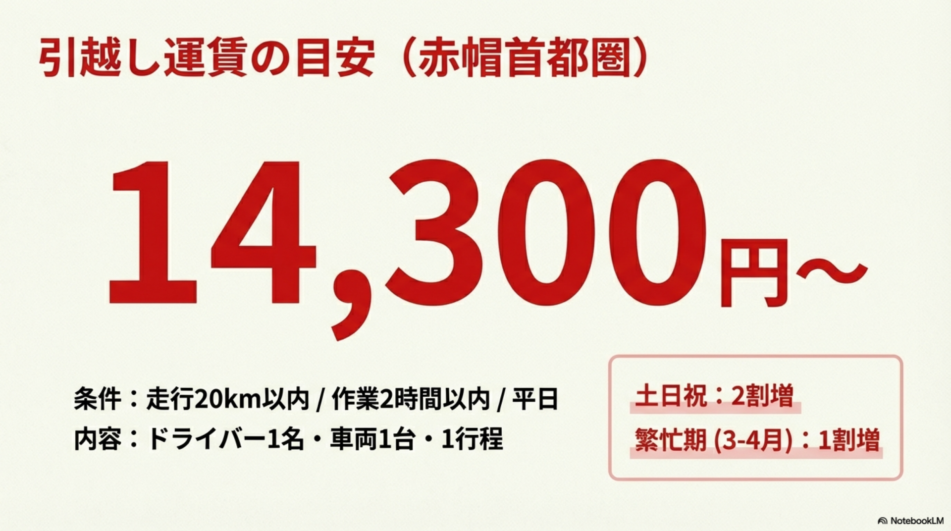 引越し運賃は作業時間2時間以内・走行距離20km以内で14,300円〜(平日・1台1行程・ドライバー1名)です。荷物の量や作業内容によって変動するため、正確な料金は見積もりで確認してください。