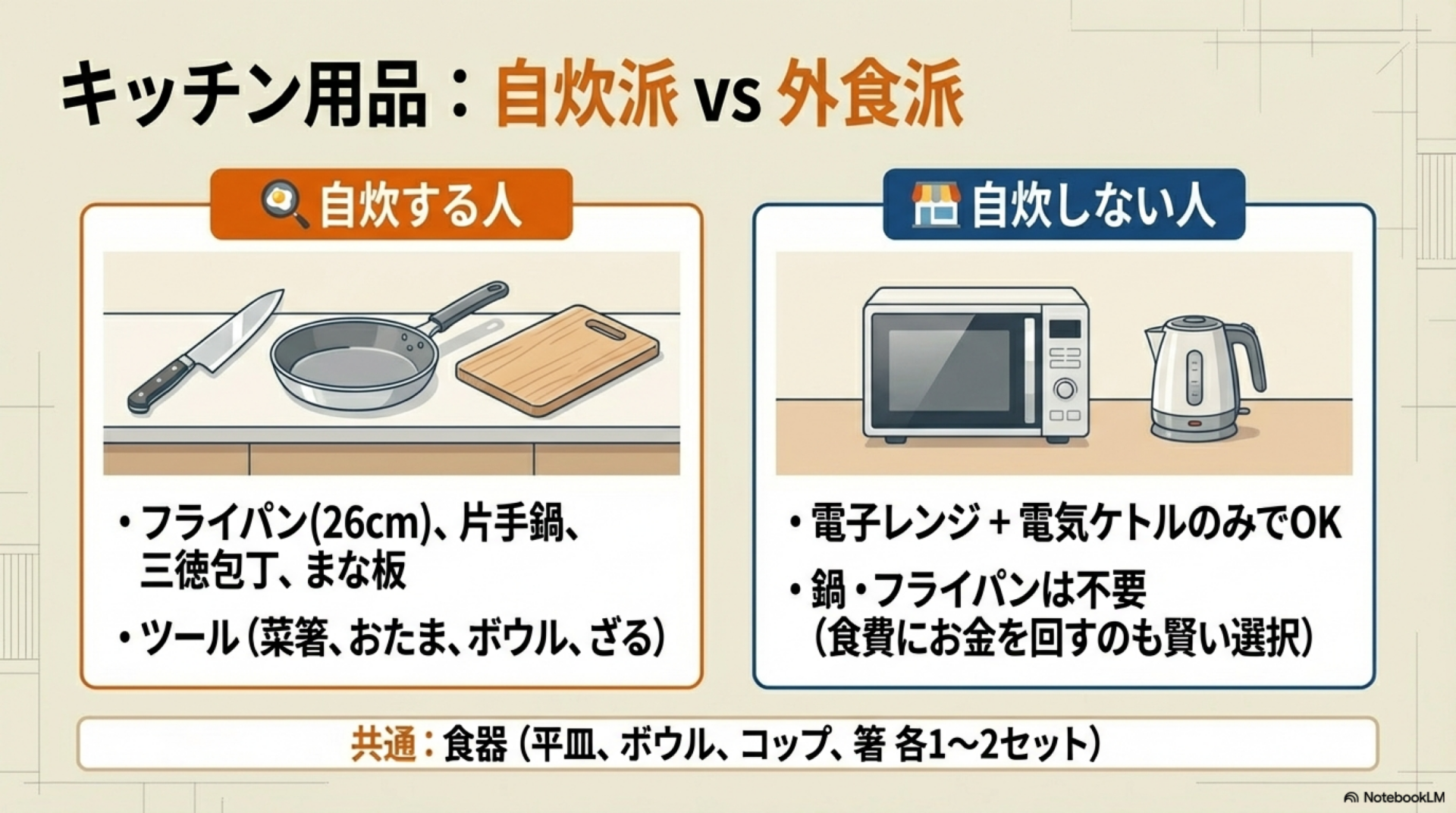 キッチン用品・調理器具:自炊するかどうかで変わる
