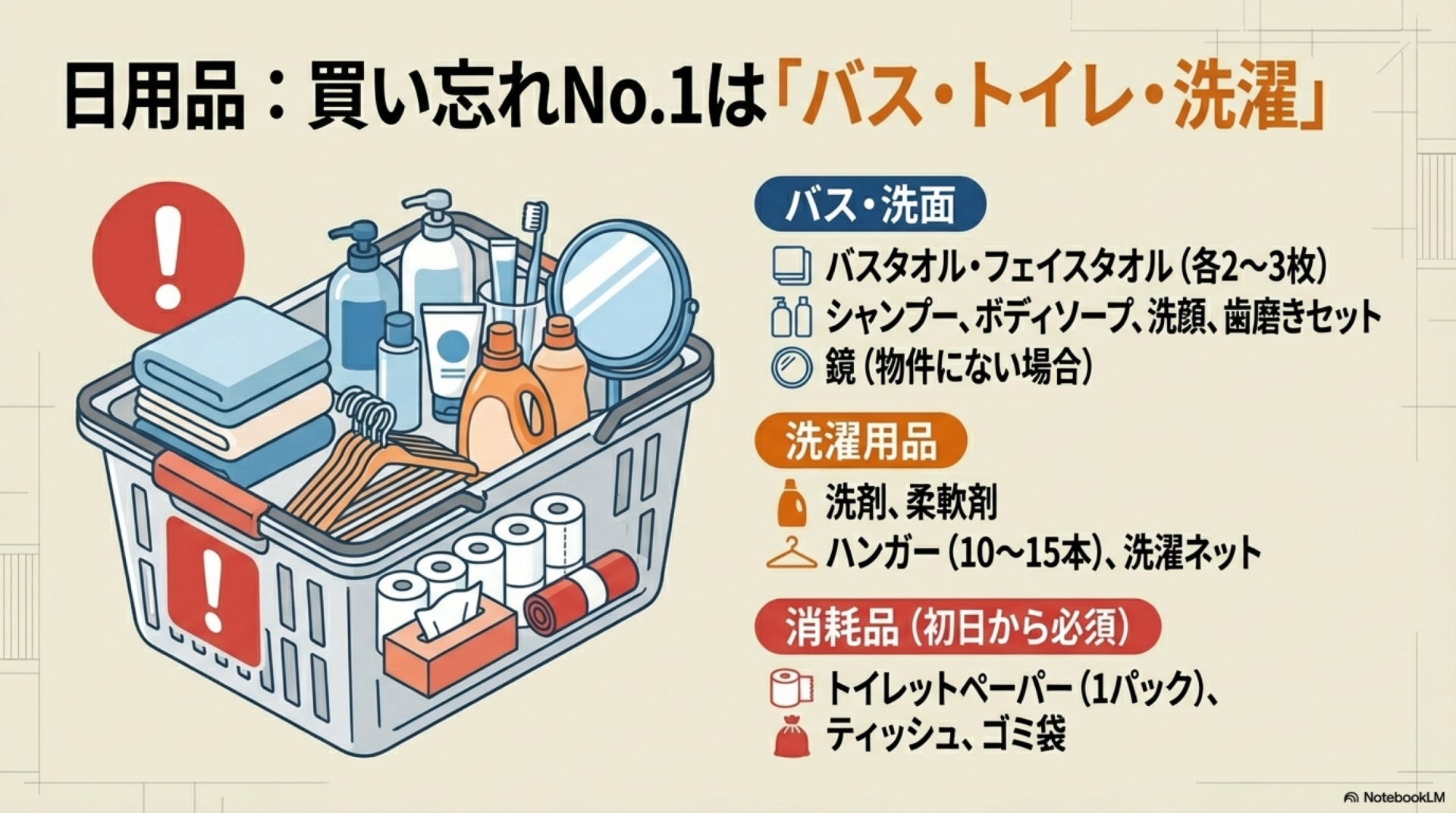 生活してみて初めてわかるニーズがこのフェーズで出てくる。ゴミ箱・ゴミ袋(自治体指定の種類を確認)、洗濯グッズ(ハンガー・洗濯ネット・物干し竿)、ティッシュペーパー・トイレットペーパーの追加ストック、掃除機はこのタイミングで揃えれば十分だ。
