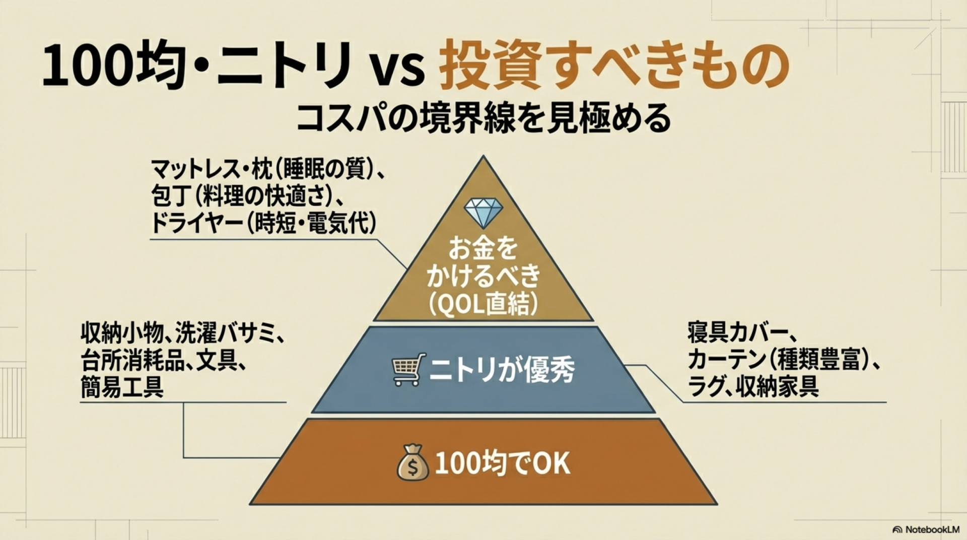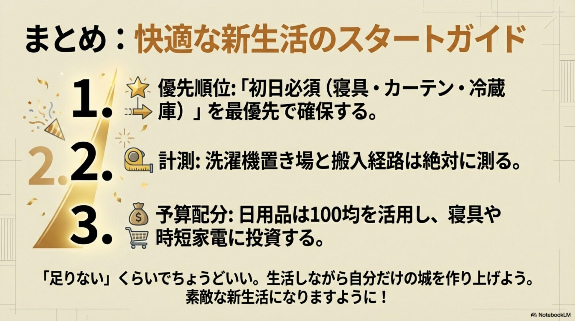 100均・ニトリで代用できるものとそうでないものを見極めながら、予算を「寝具」「防犯」「包丁」などの生活の質に直結するアイテムに集中させると、満足度の高い新生活スタートが切れる。