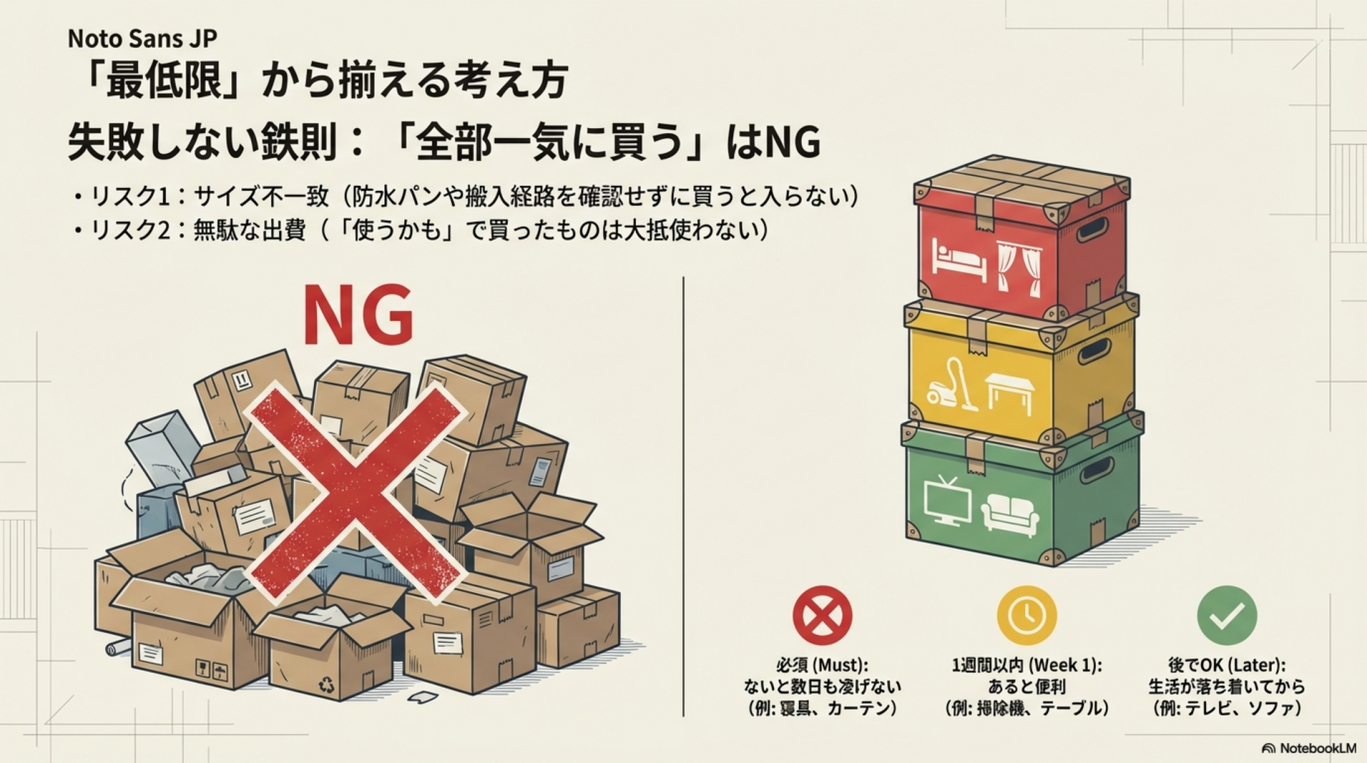 引越しのタイミングで全部を揃えようとするのは、2つの理由で失敗しやすい。