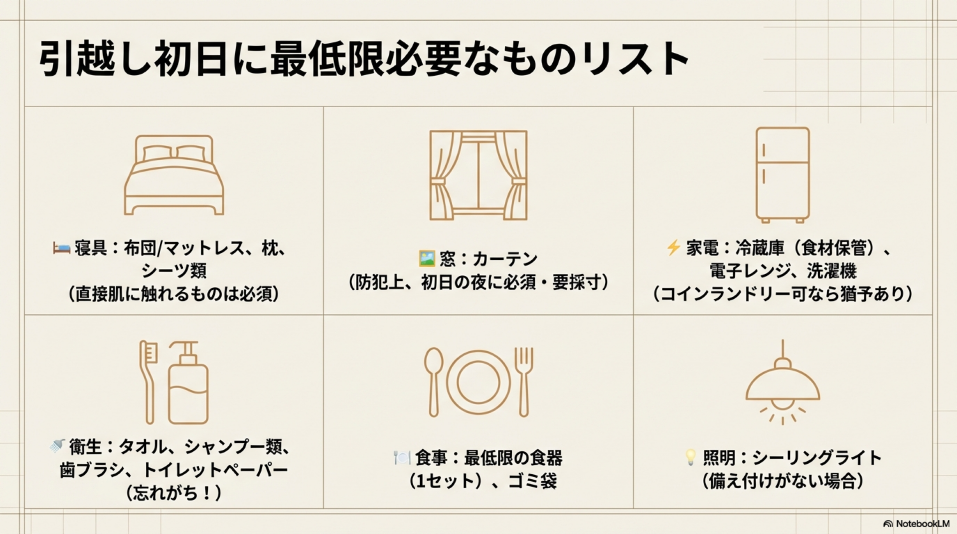 寝具・カーテン・タオル・トイレットペーパー・シャンプー等の衛生用品は引越し当日から必要だ。これらは荷物ではなく手荷物として持ち込むか、当日に近隣のコンビニで購入できるよう準備しておくといい。