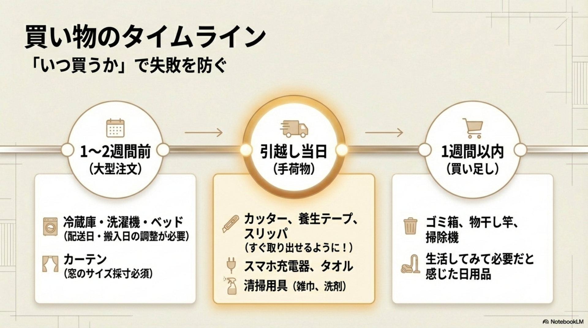 買い物のタイムライン|引越し前・当日・後でやること