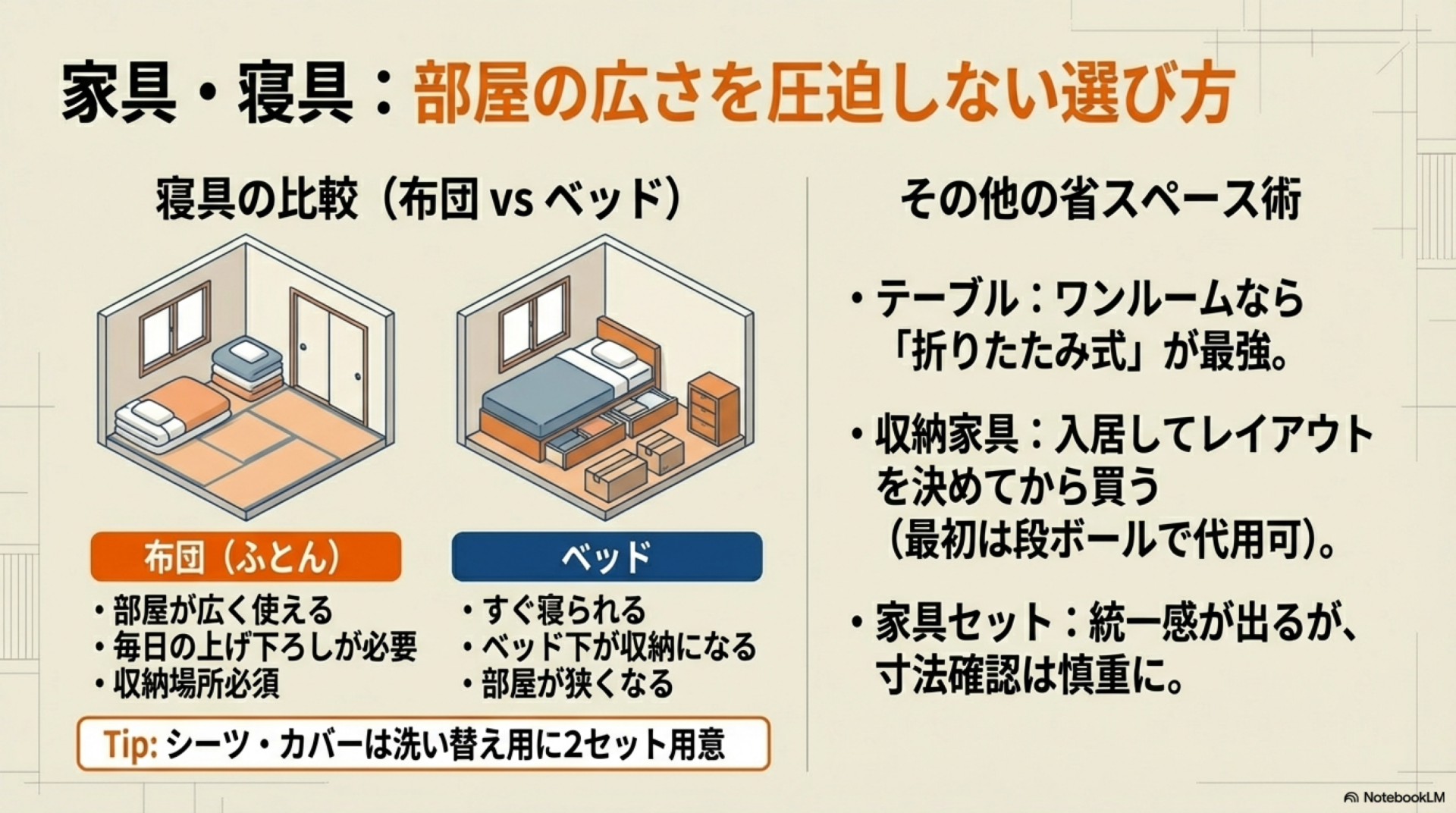 寝具は引越し初日から必要であり、最優先で準備する。ベッドか布団かの選択は、部屋の広さと生活スタイルで判断する。