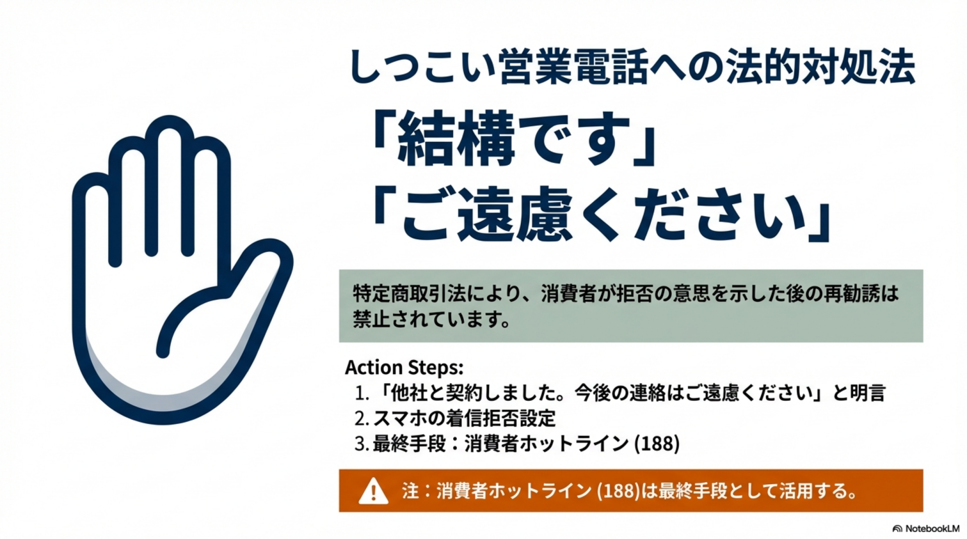 つまり、「お断りします」「いりません」とはっきり伝えた後に、なおも営業を続ける行為は法律に抵触する可能性があります。「検討します」「今は忙しいので」といった曖昧な表現は法的に「断った」とはみなされないため、明確な拒否の意思を示すことが重要です。