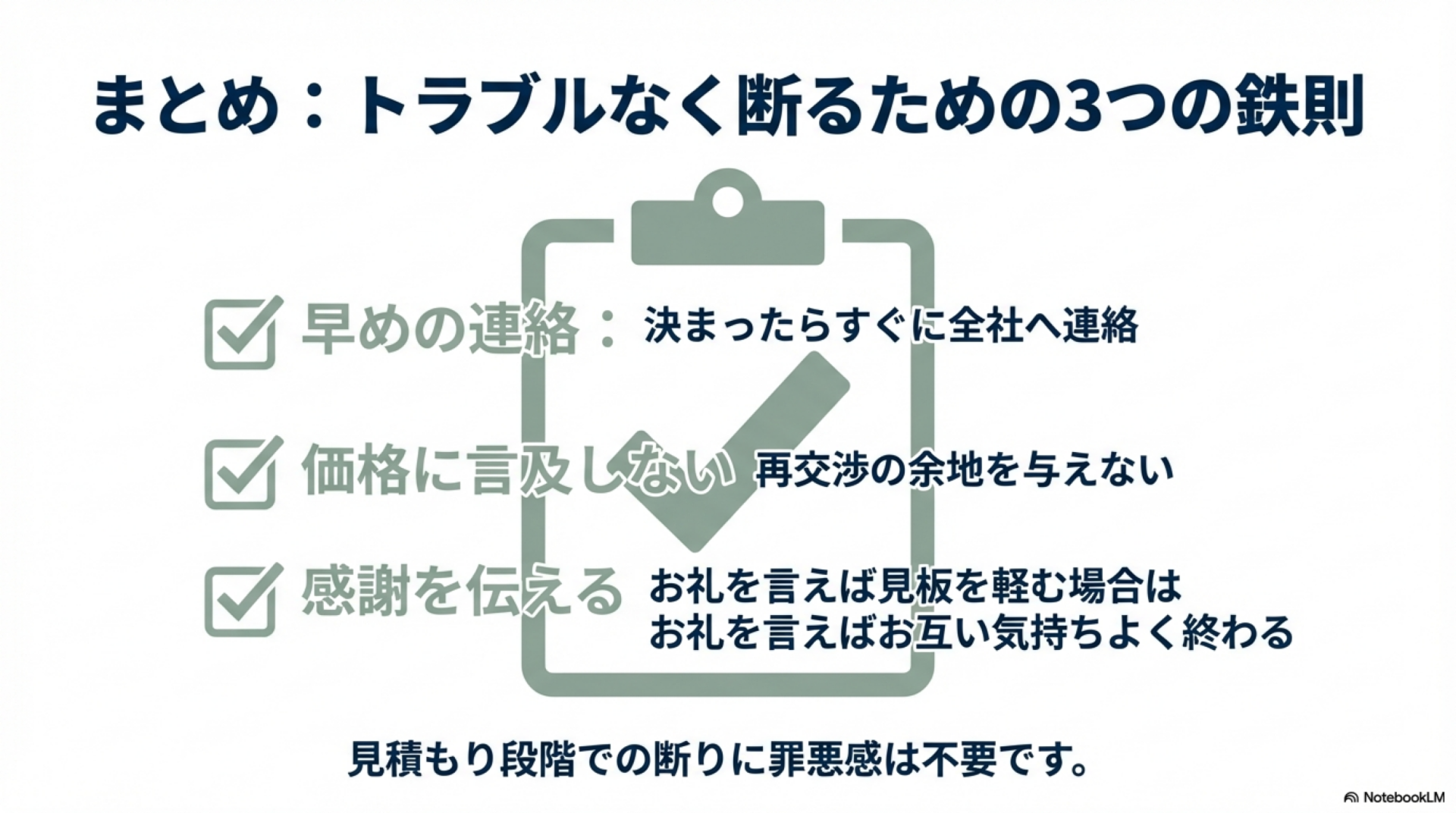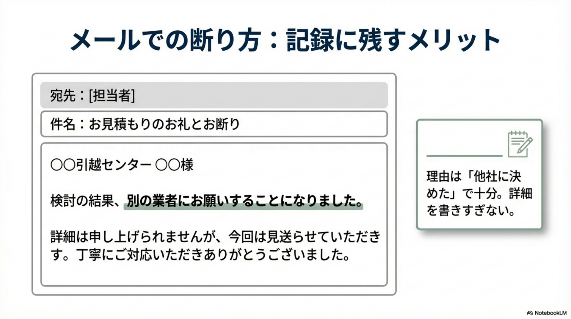 - ✉️ 断る理由を詳しく書きすぎない:「別の業者に決めた」で十分。金額や条件に触れると返信で値引き提案が来る