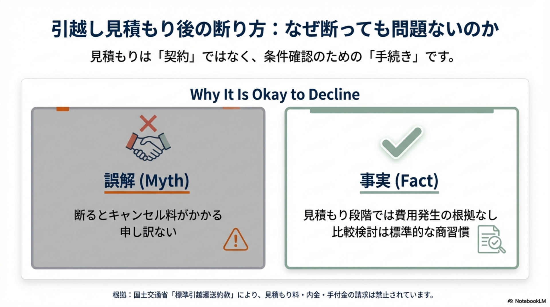 国土交通省が定める標準引越運送約款(全日本トラック協会)でも、「見積料は請求しません」「見積りの際に内金、手付金等を請求しません」と明記されています。つまり、見積もり段階では料金が発生する根拠がそもそもないということです。