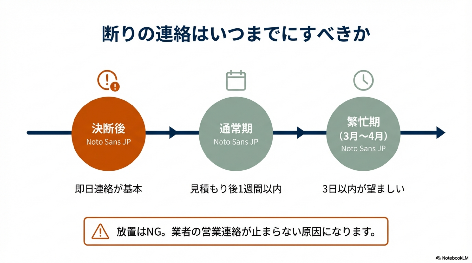 - 🕐 決断後:即日連絡が基本