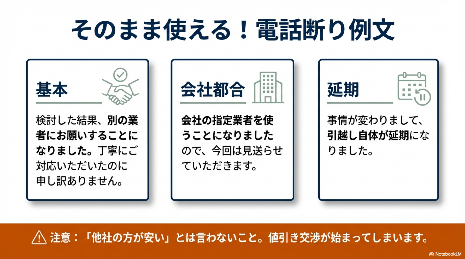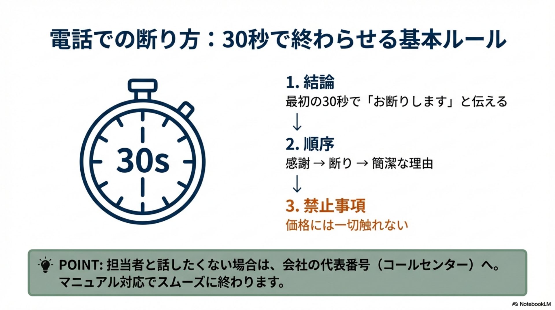 - 📞 感謝→断り→簡潔な理由の順で話す