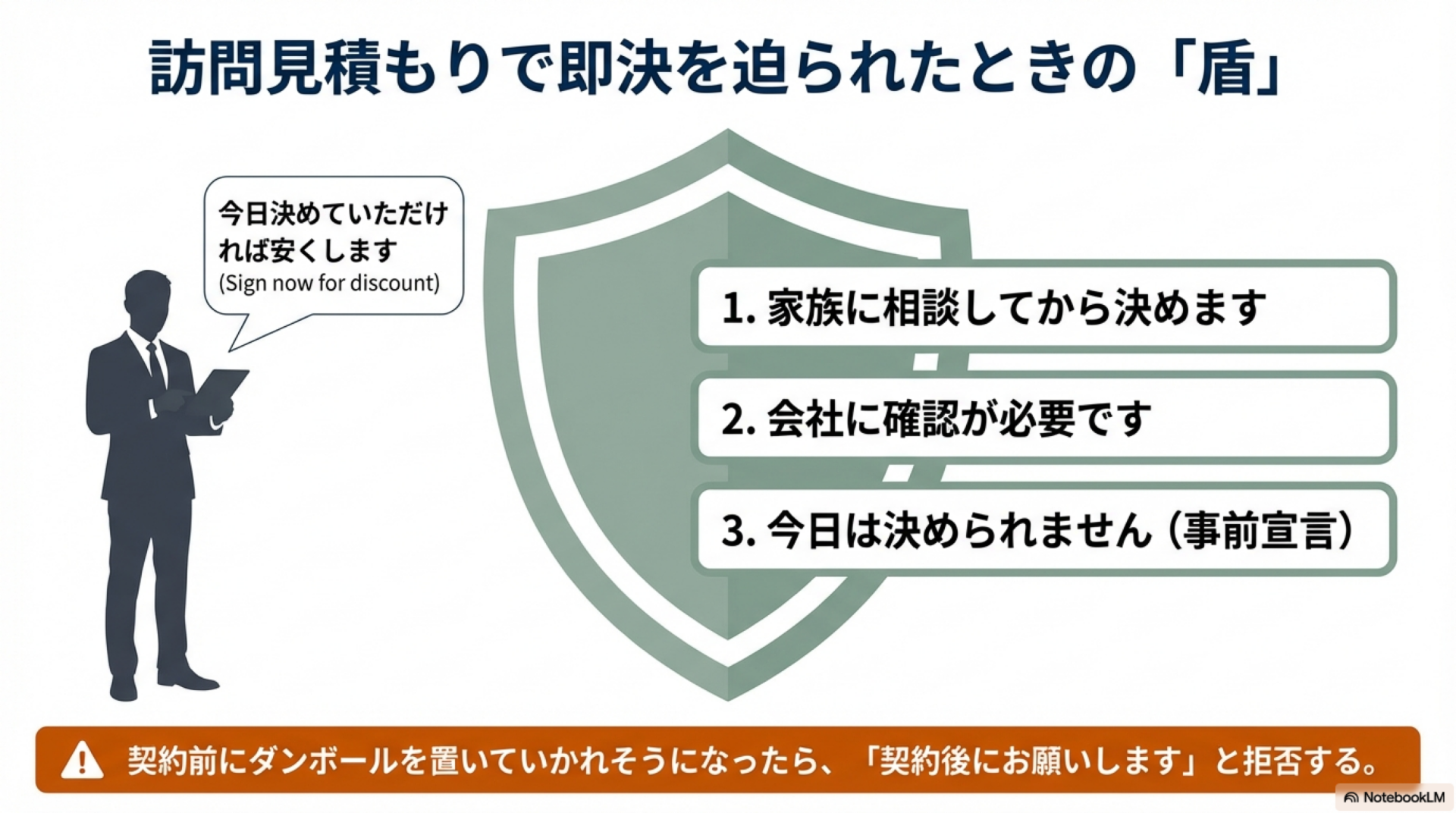 - 🗣️ 「家族に相談してから決めます」:最も無難で、営業担当者も引き下がりやすい