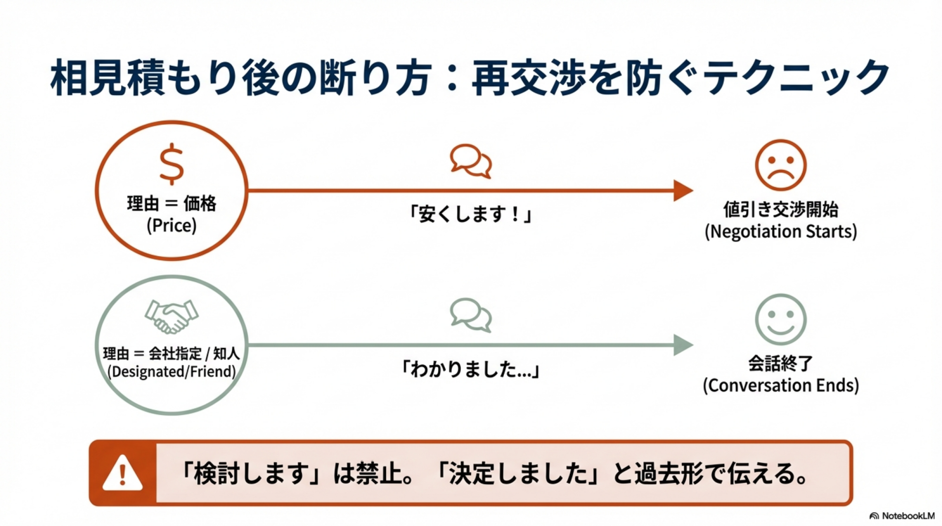 - 🔹 「知人の紹介で頼むことにした」:人間関係が理由なので値引きでは覆せない