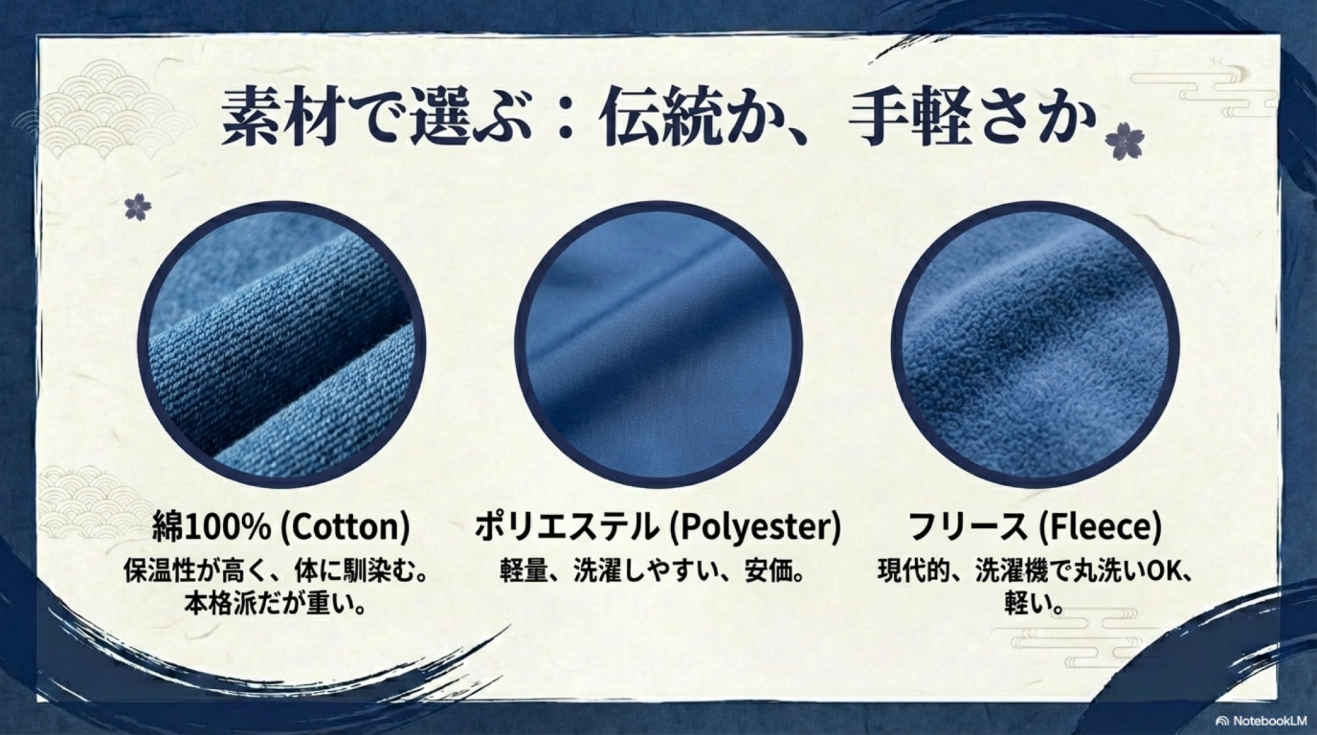 **綿100%**は保温性が高く、体に馴染む着心地が魅力ですが、洗濯すると中綿が偏りやすいデメリットがあります。長く愛用したい方や、伝統的な製品を求める方におすすめです。