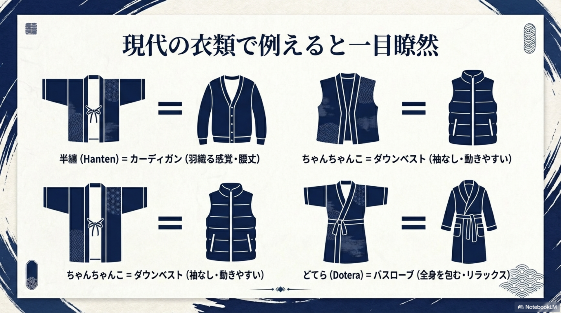 この記事を読めば、3つの違いが明確に理解でき、あなたの生活スタイルに最適な防寒着を自信を持って選べるようになります。実は、半纏はカーディガン、ちゃんちゃんこはダウンベスト、どてらはバスローブと考えると、とてもわかりやすくなります。