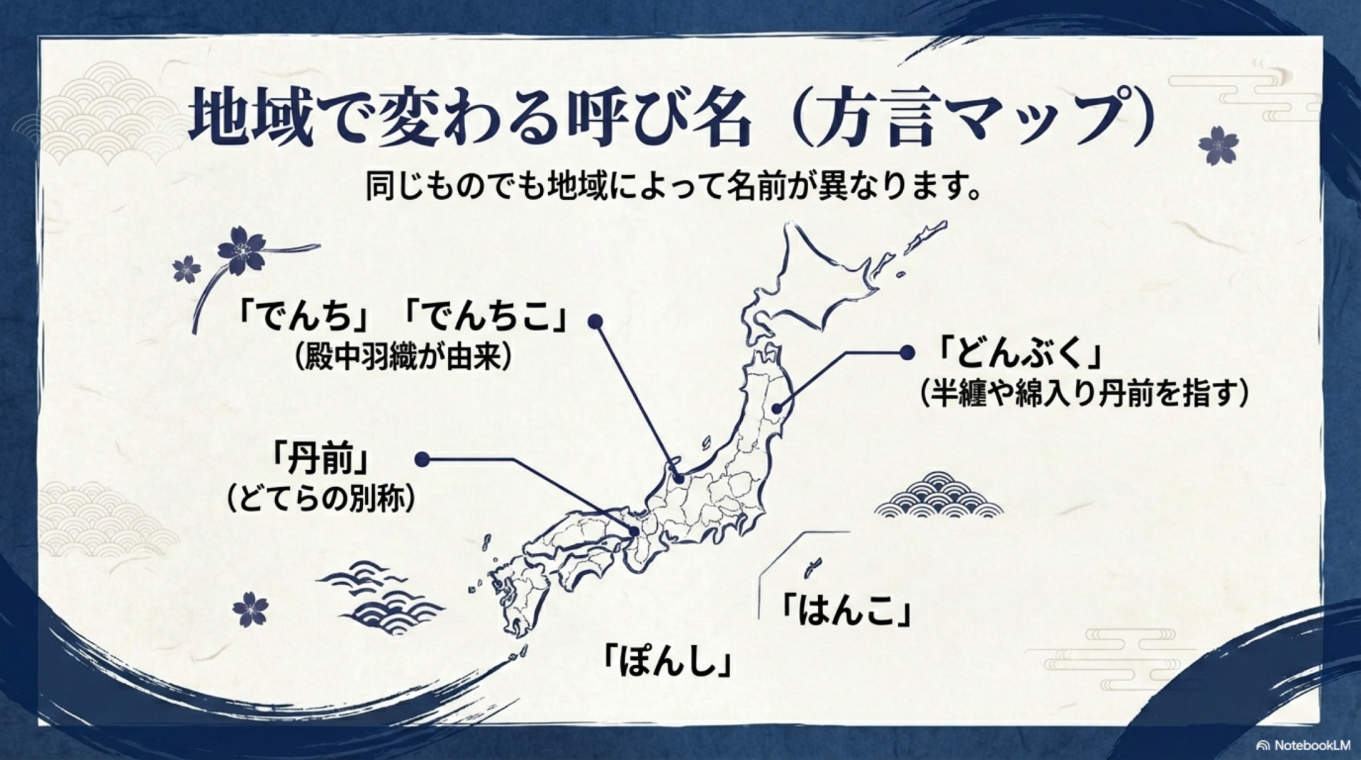 | 地域呼称 | 全国共通 | 地域で異なる | 関東=どてら、関西=丹前 |