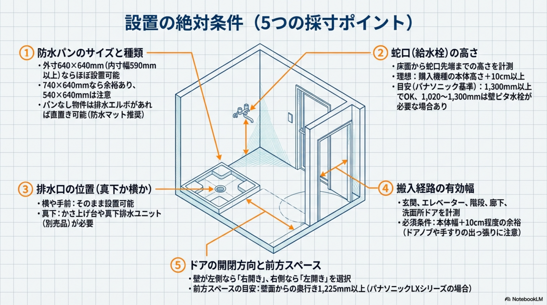 ドラム式洗濯機が賃貸に置けるかどうかは、設置スペース・蛇口・排水口・搬入経路・ドアの開閉の5つで決まります。購入前にメジャーを使って正確に測り、メモを取っておきましょう。