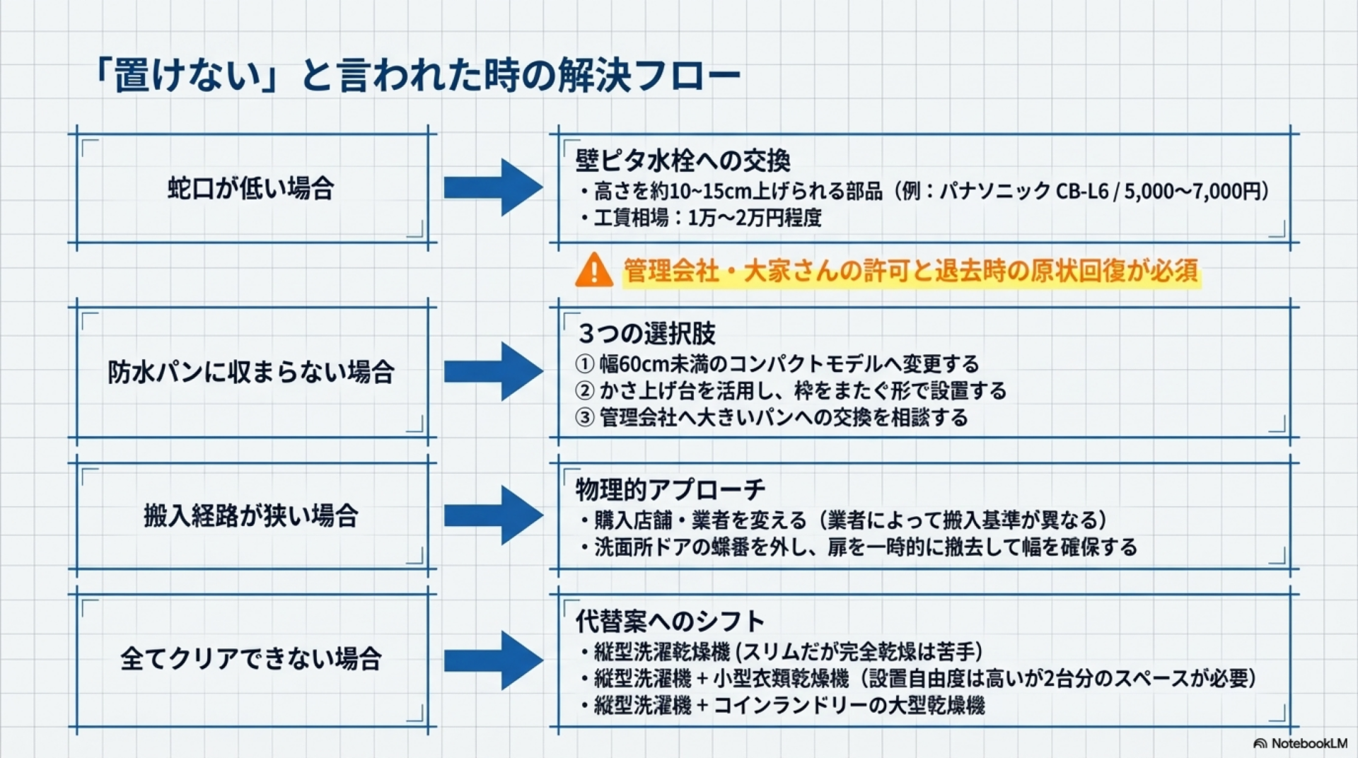 設置確認をした結果「このままでは置けない」と判明しても、すぐに諦める必要はありません。原因別に対処法があります。