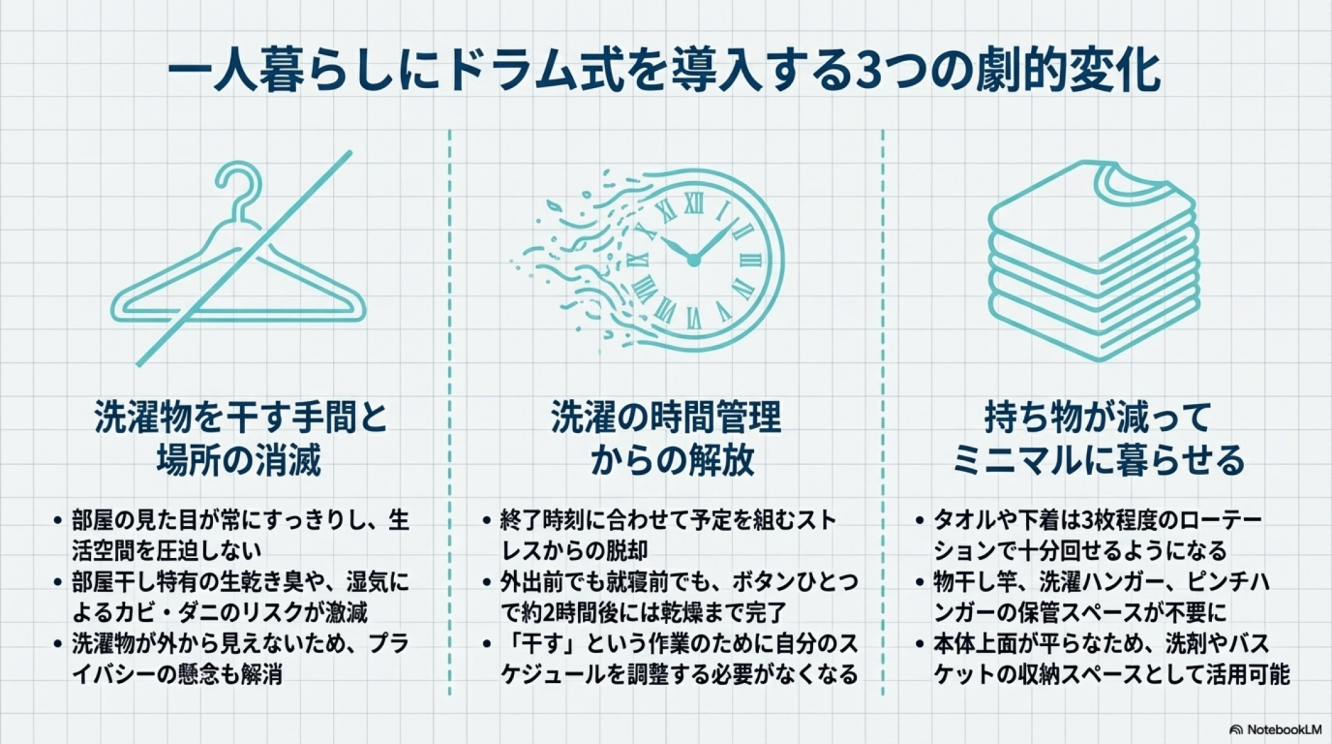 さらに、物干し竿・洗濯ハンガー・ピンチハンガーといった道具自体が不要になるため、それらの保管スペースも節約できます。引っ越しの多い一人暮らしにとって、持ち物が少ないメリットは大きいでしょう。