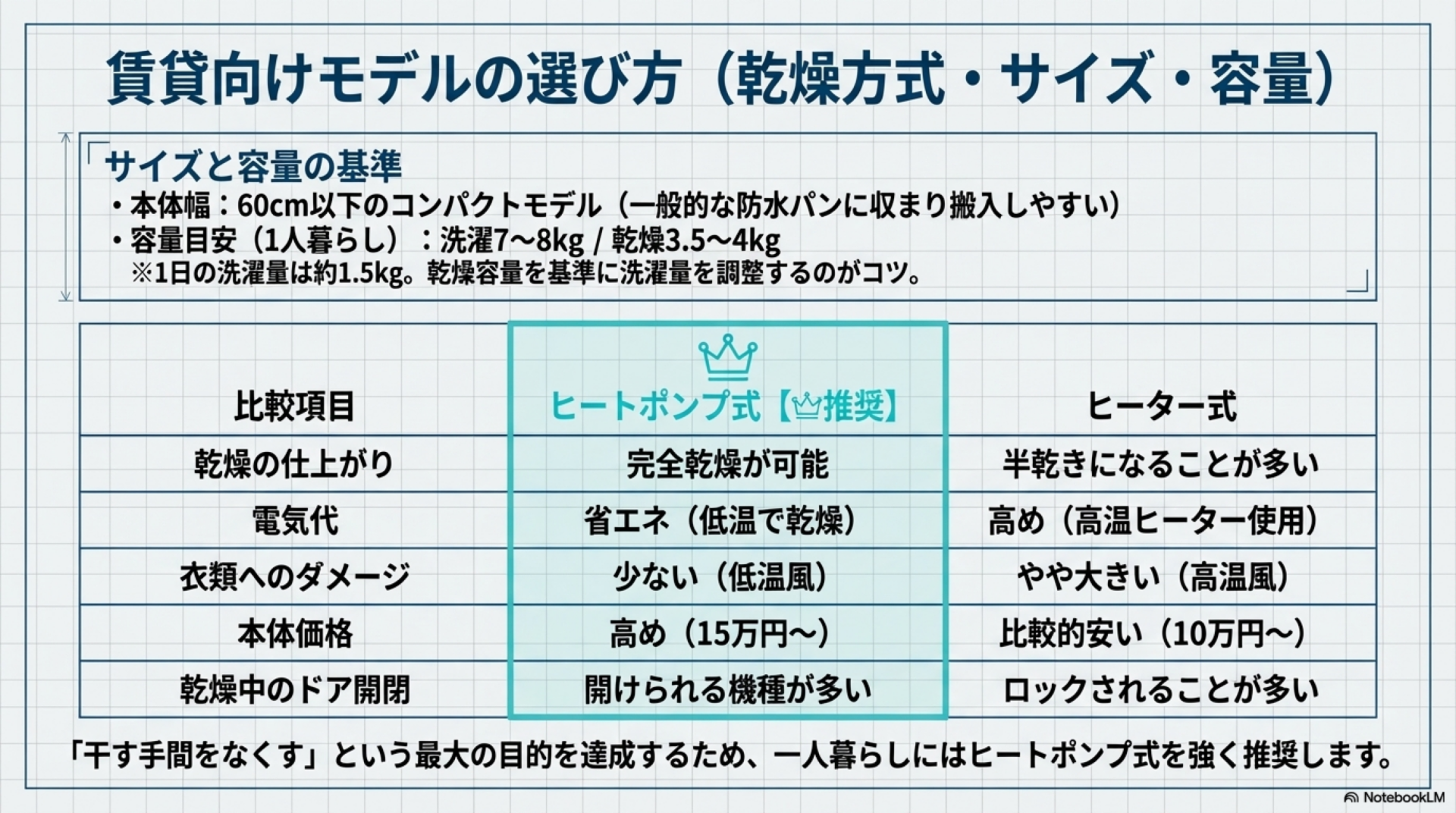 賃貸物件に設置するドラム式を選ぶときは、乾燥方式・容量・本体サイズの3点を軸に検討します。