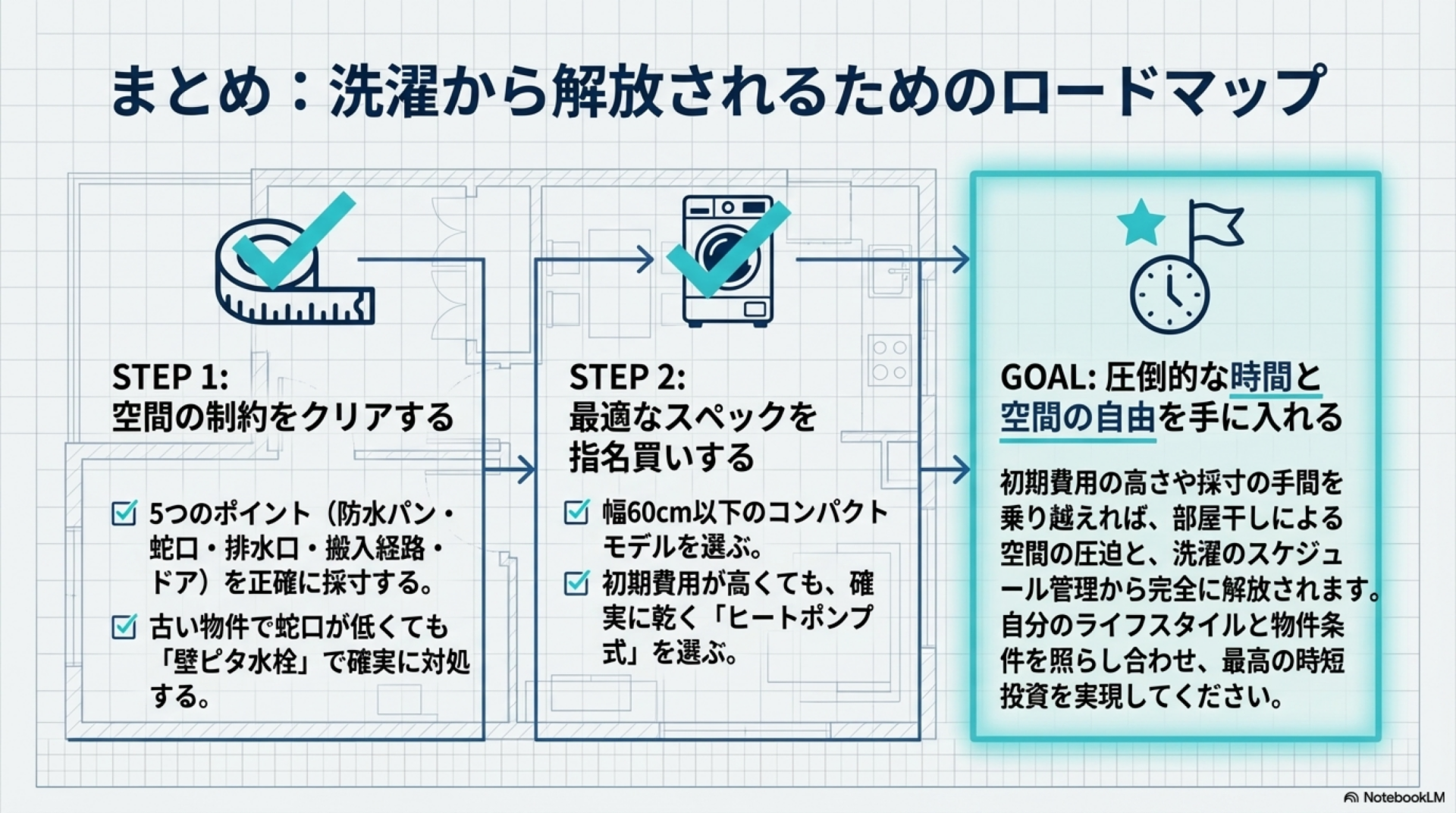 選ぶ際はヒートポンプ式の乾燥方式と幅60cm以下のコンパクトモデルを基準にすること、そしてコスト面では購入価格だけでなく長期的な水道光熱費の削減効果まで含めて判断することがポイントです。自分のライフスタイルと物件の条件を照らし合わせて、最適な選択をしてください。
