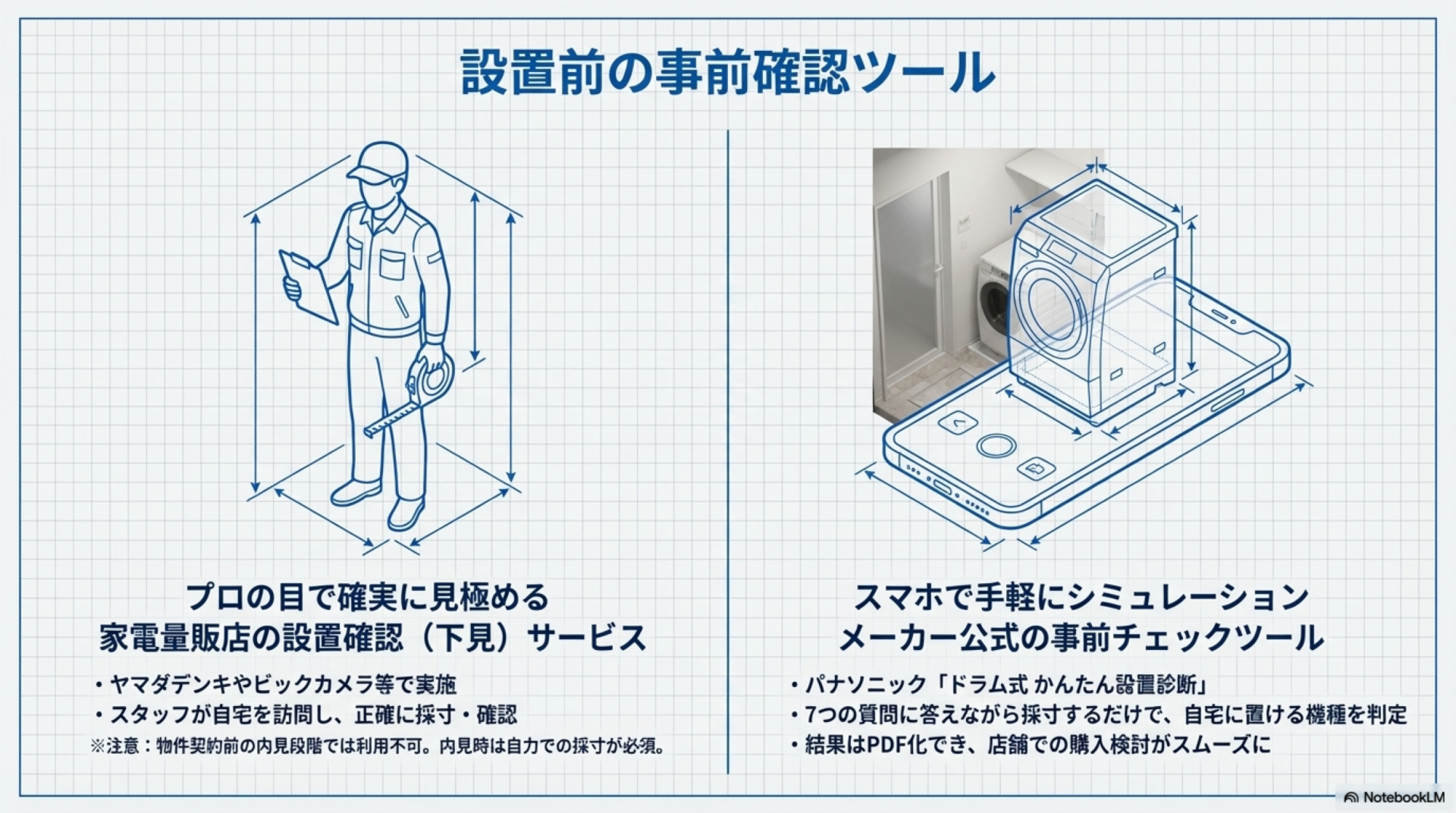パナソニックは、洗濯機置き場を計測しながら7つの質問に答えると、自宅に置けるドラム式を確認できる「ドラム式 かんたん設置診断」を公式サイトで提供しています。
