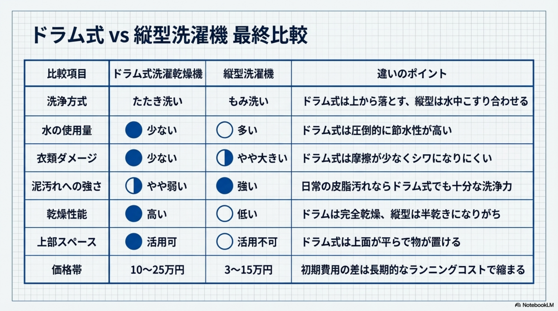 ドラム式と縦型のどちらが自分に合うか判断するために、主な違いを整理しておきます。