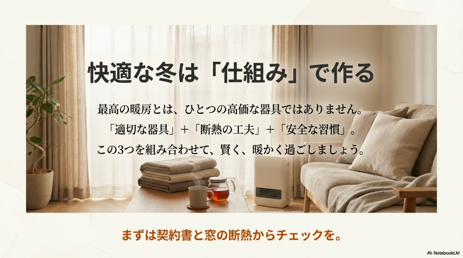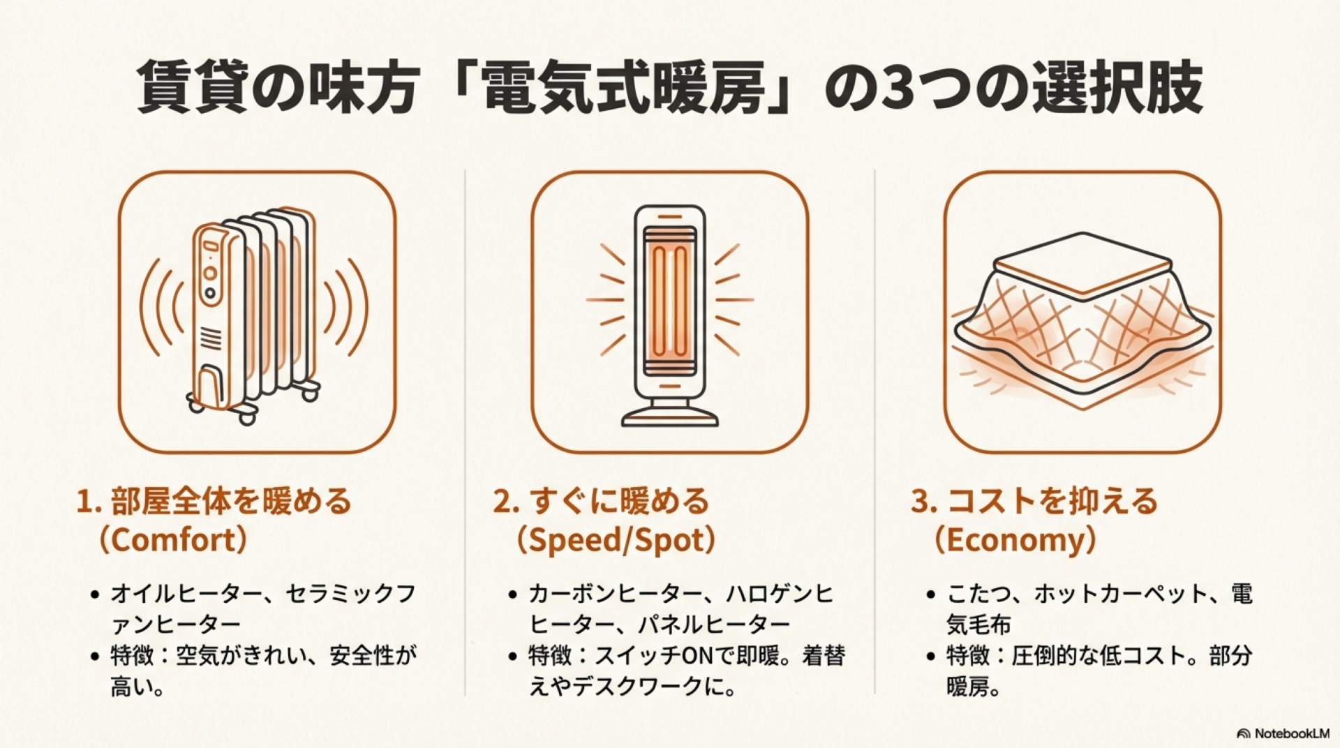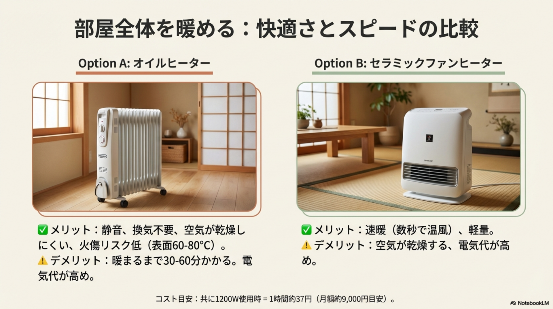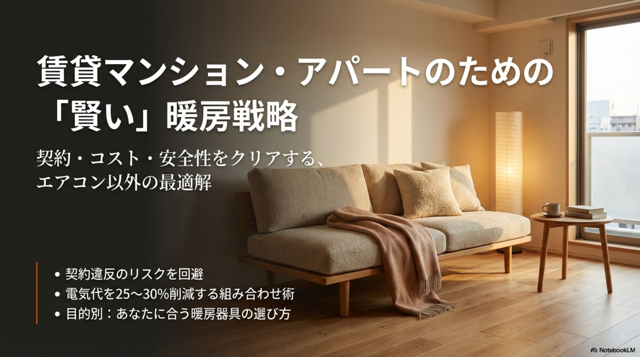 読み終える頃には、自分の部屋と予算に合った暖房器具が明確になり、電気代25〜30%削減も実現できる具体的な方法がわかります。