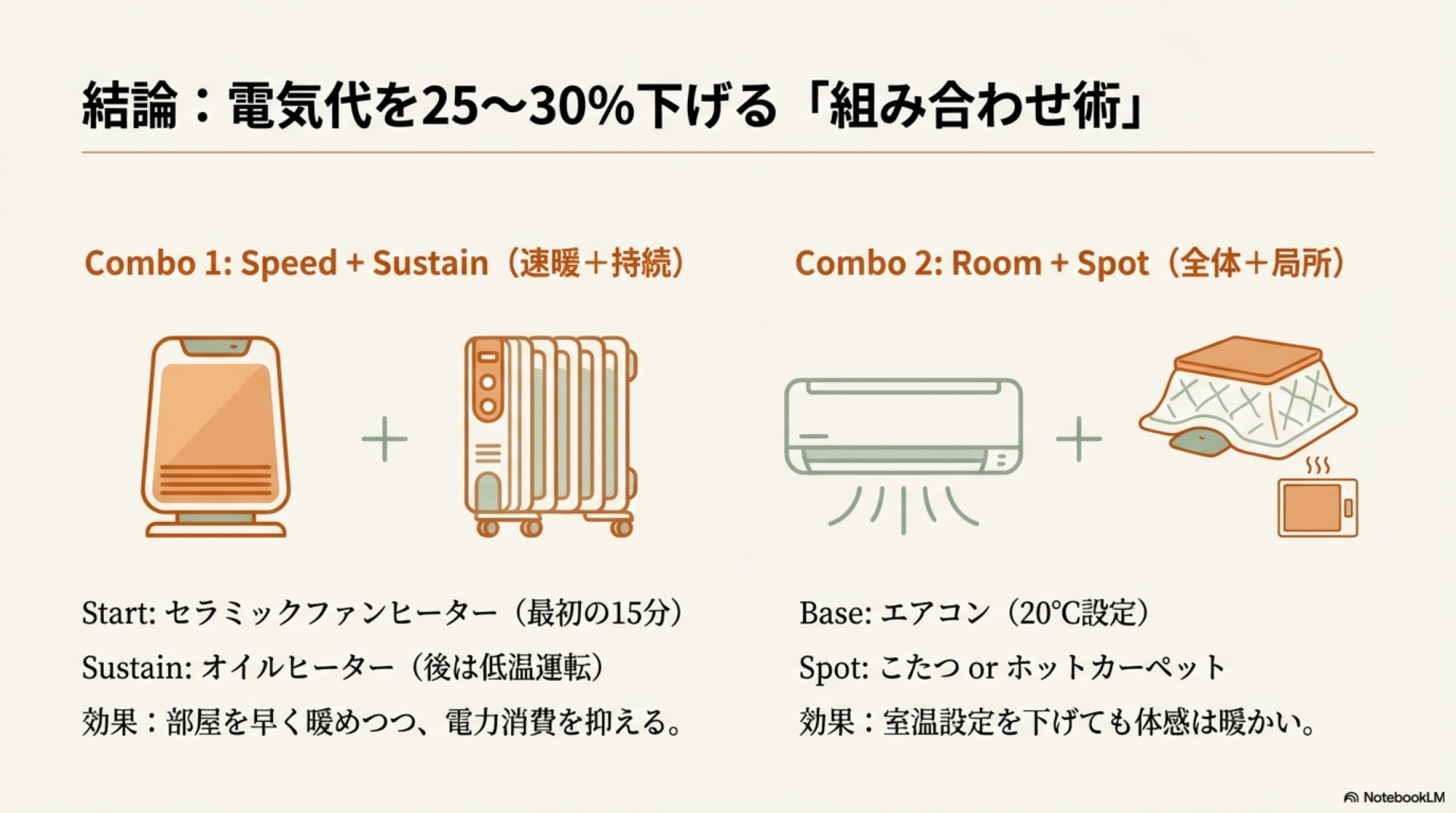 - 複数の暖房器具を組み合わせる(電気代25〜30%削減可能)