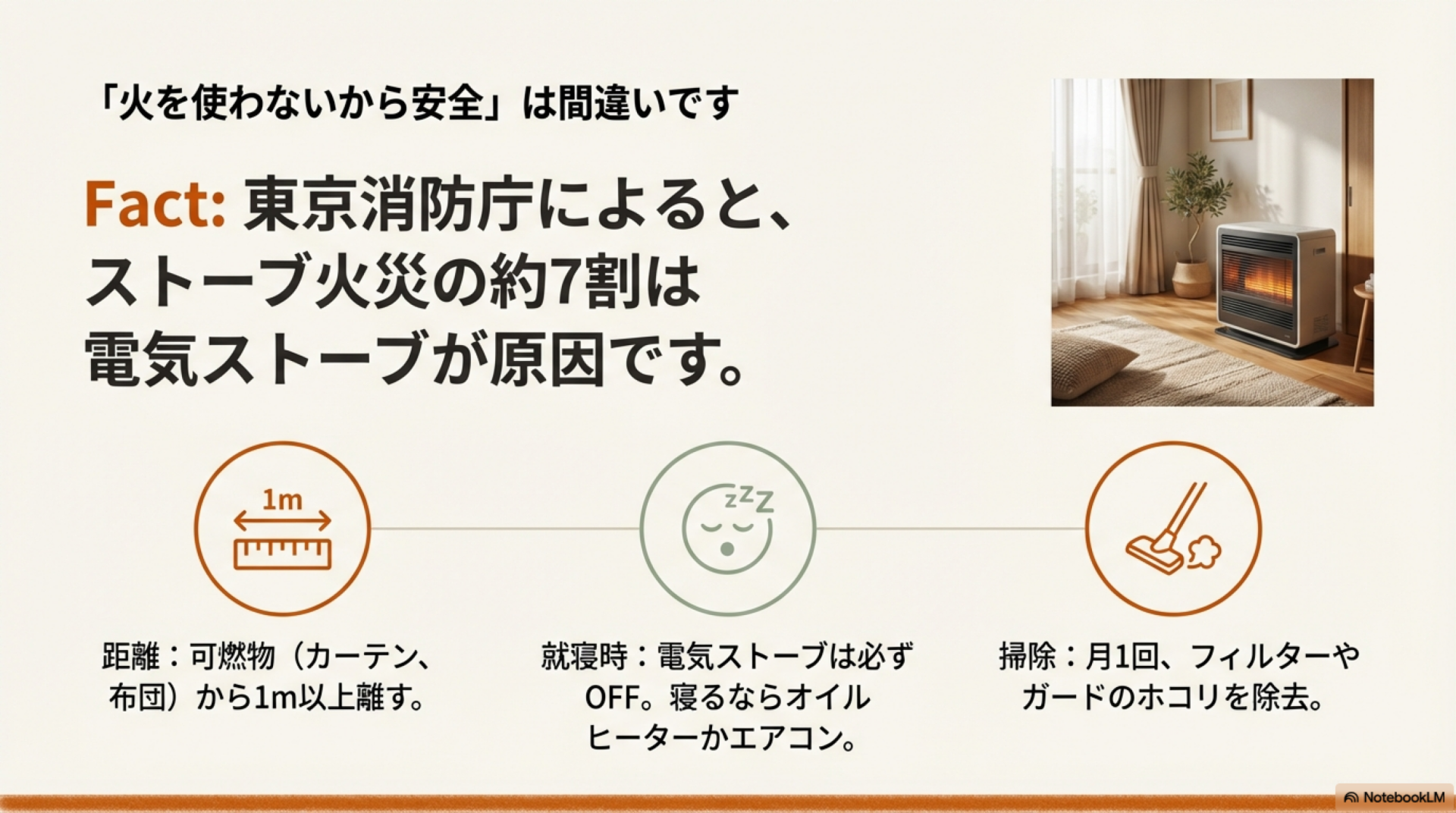 いいえ。東京消防庁の調査によると、ストーブ火災の約7割は電気ストーブが原因です。「火を使わないから安全」という認識は危険で、可燃物との距離確保や就寝時の使用禁止など、適切な使用方法を守る必要があります。