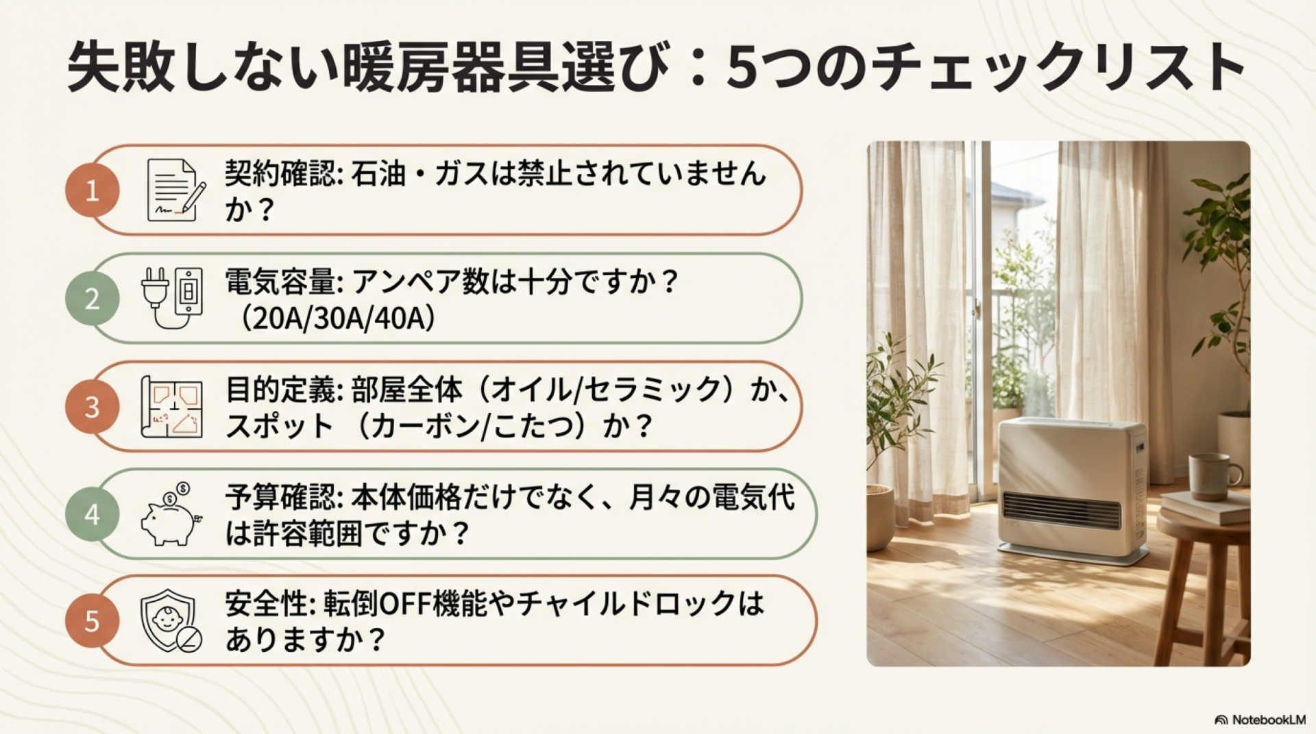 このチェックリストを使用することで、賃貸住宅での暖房器具選びの失敗を防ぎ、安全で快適な冬を過ごすことができます。
