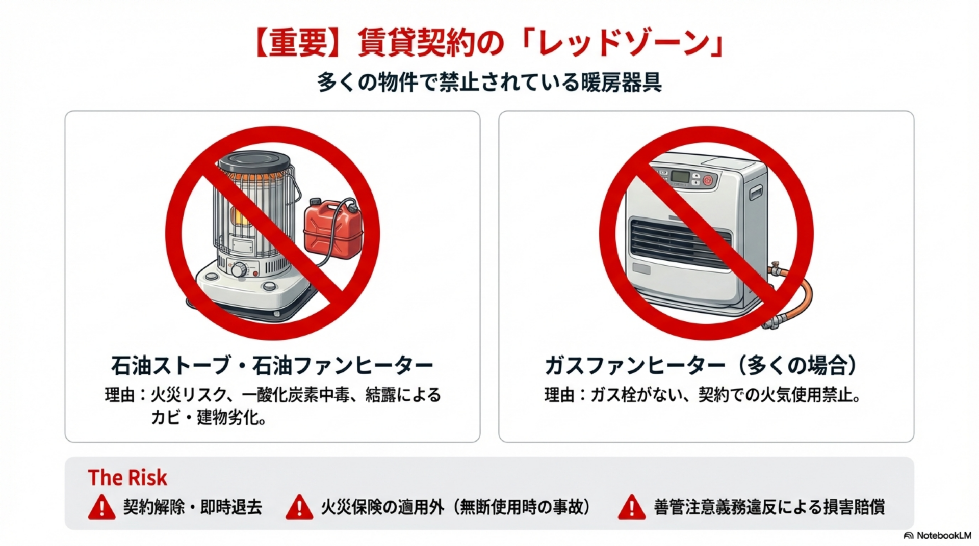 | 暖房器具 | 禁止理由 | 契約違反時のリスク |
