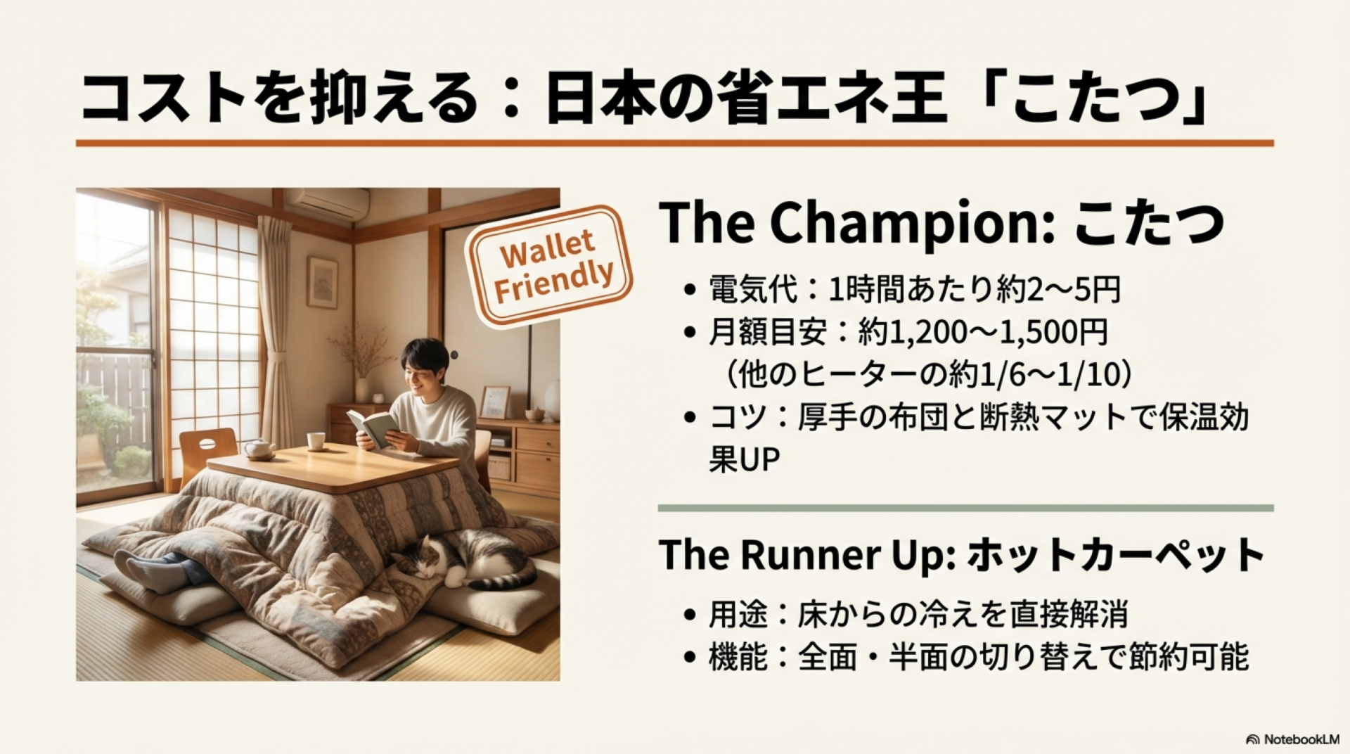 - 電気代を抑えたい→こたつ、ホットカーペット