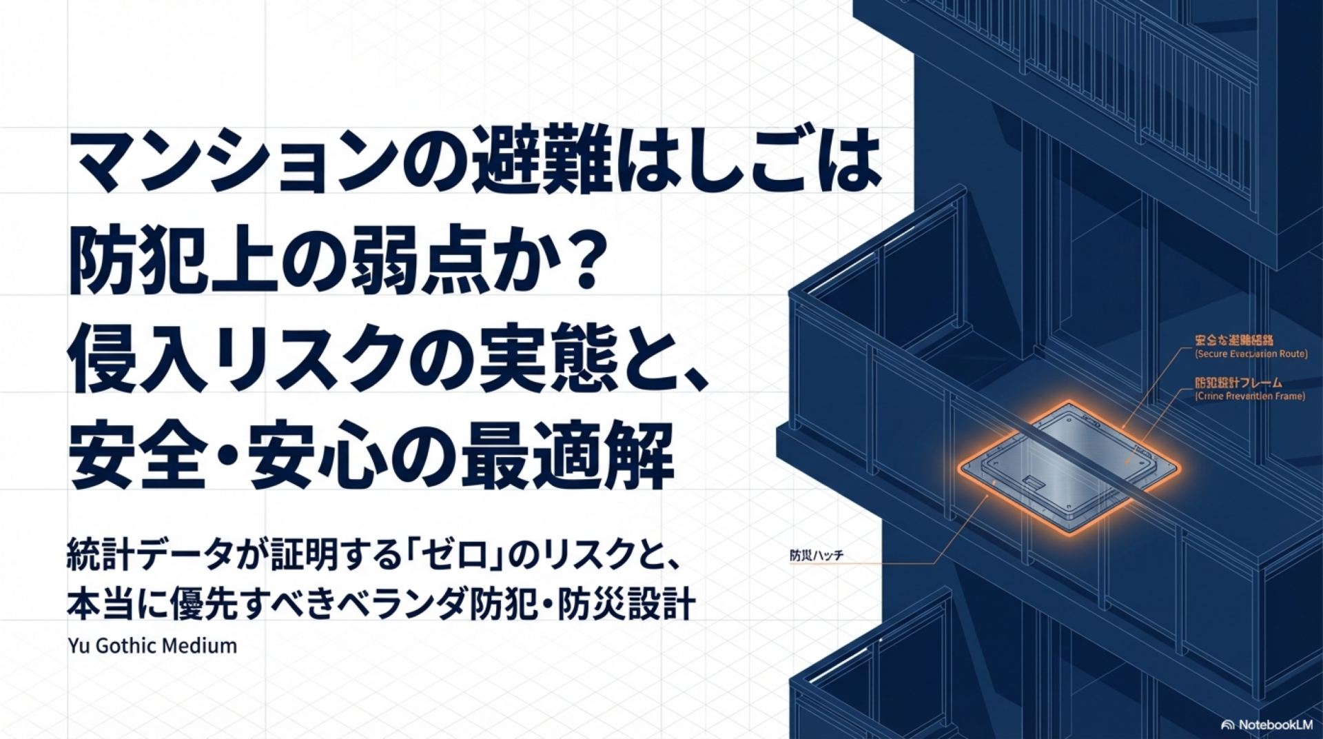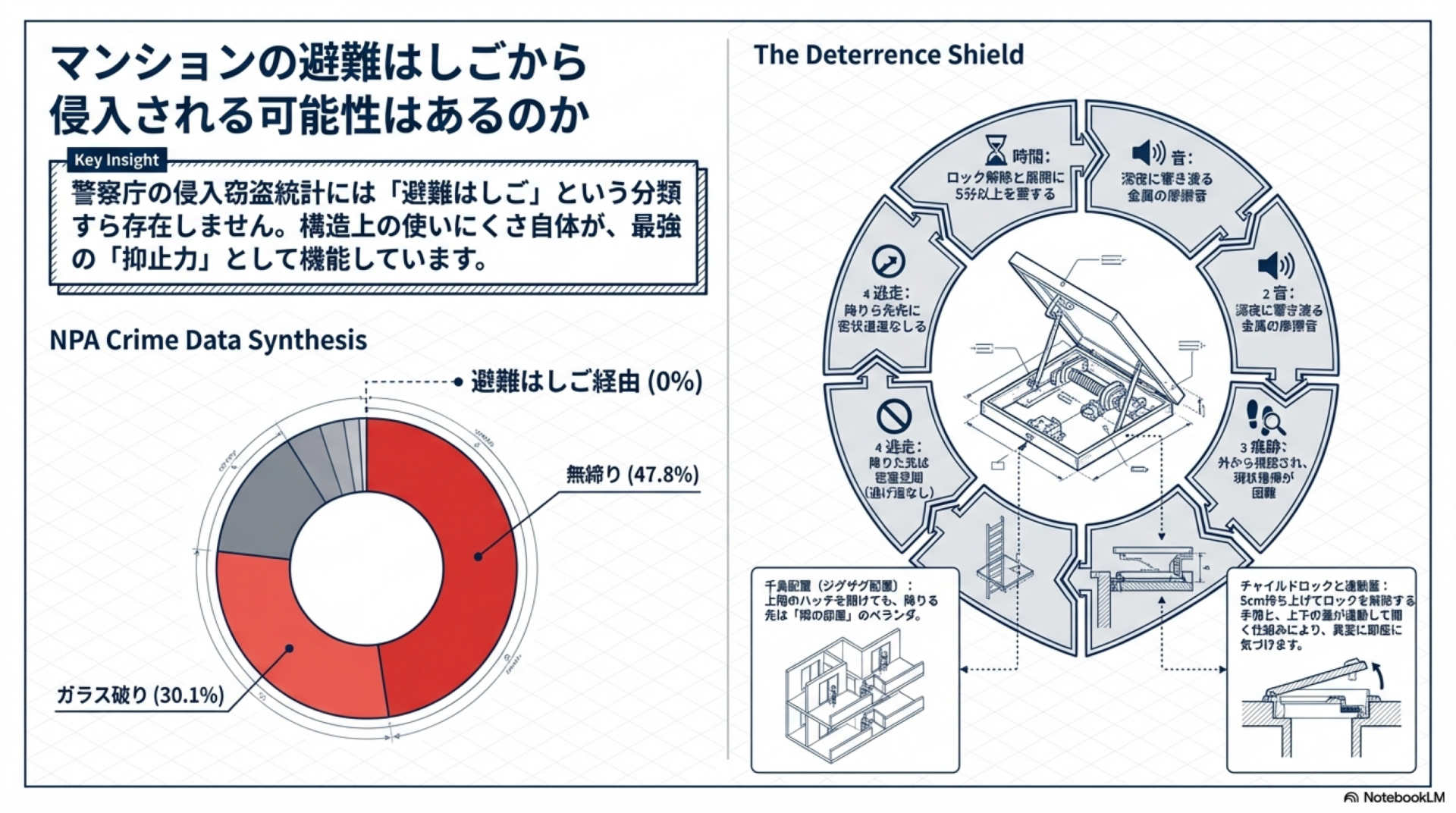 マンションの避難はしご(避難ハッチ)は、防犯上の弱点ではありません。警察庁の侵入窃盗統計には「避難はしご経由の侵入」というカテゴリ自体が存在せず、操作に時間がかかる・大きな音が出る・痕跡が消せない・逃走経路が確保できないという構造的な特徴が、そのまま侵入の抑止力として機能しています。
