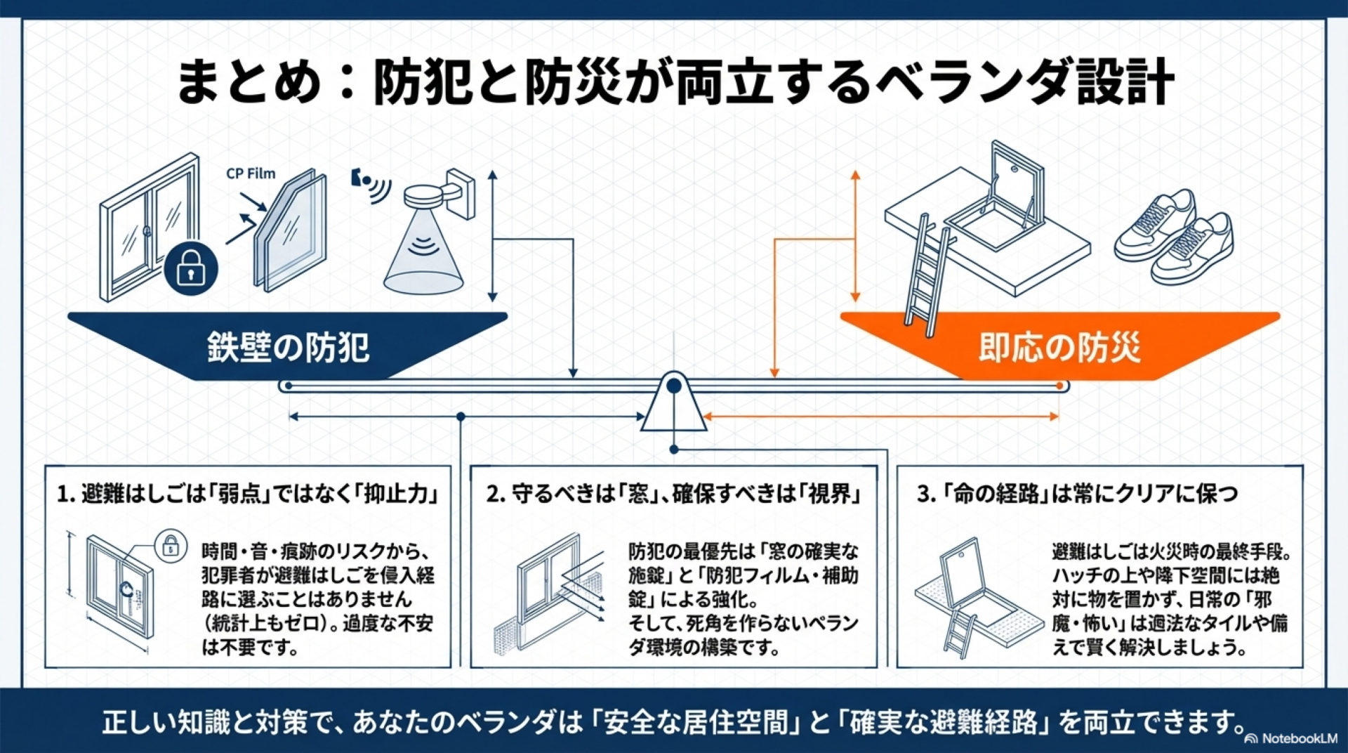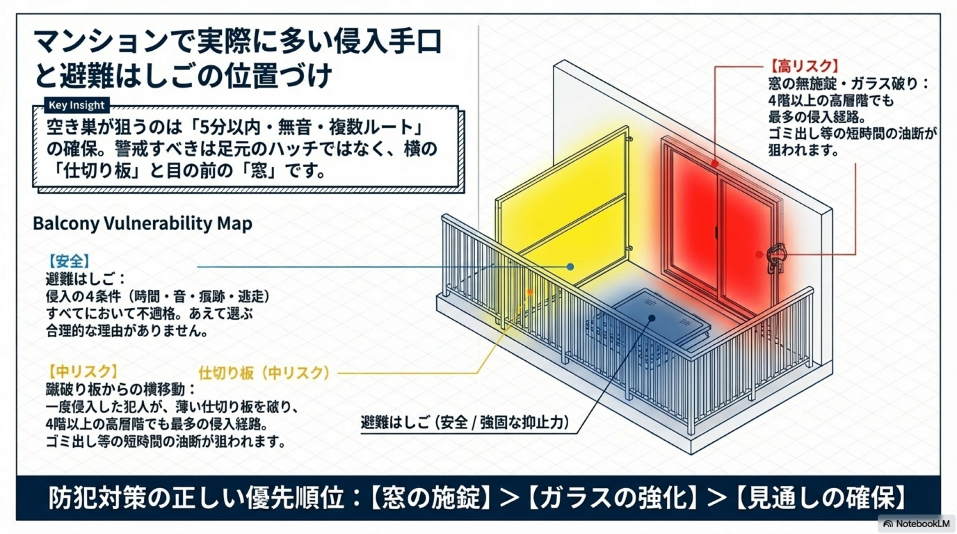 避難はしごは操作に時間がかかり、音が出て、痕跡が残るという三重の抑止力がありますが、蹴破り板と窓にはそうした抑止力がありません。**防犯対策の優先順位は「窓の施錠 > 窓ガラスの強化 > ベランダの見通し確保」**の順に考えるのが合理的です。