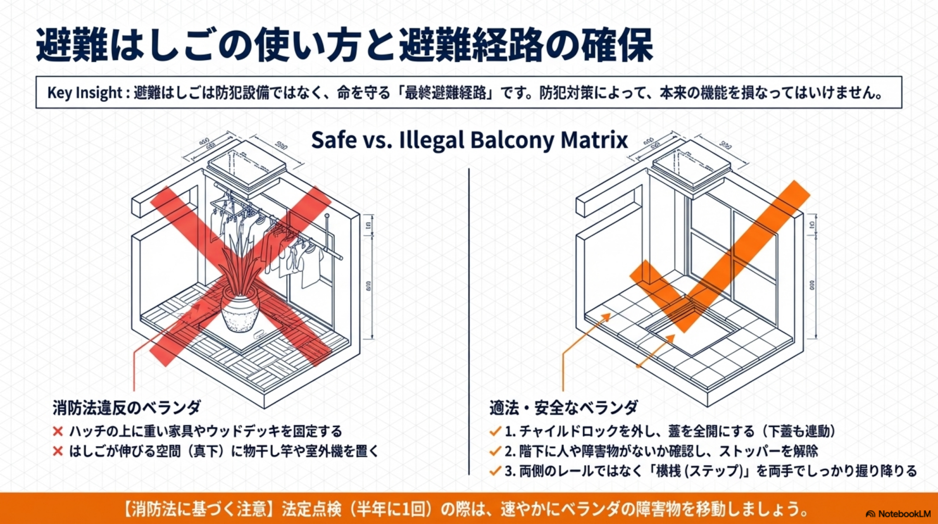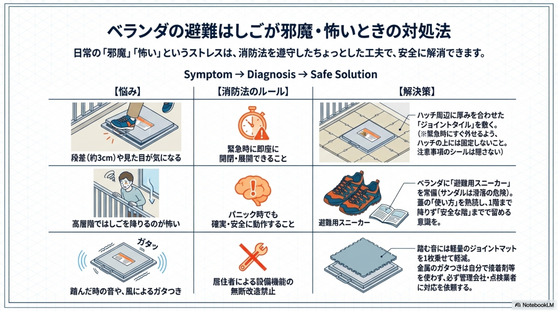 ⚠️ 注意点として、サンダルでは滑りやすく危険です。ベランダに避難用のスニーカーを1足置いておくと、いざという時にスムーズに避難できます。