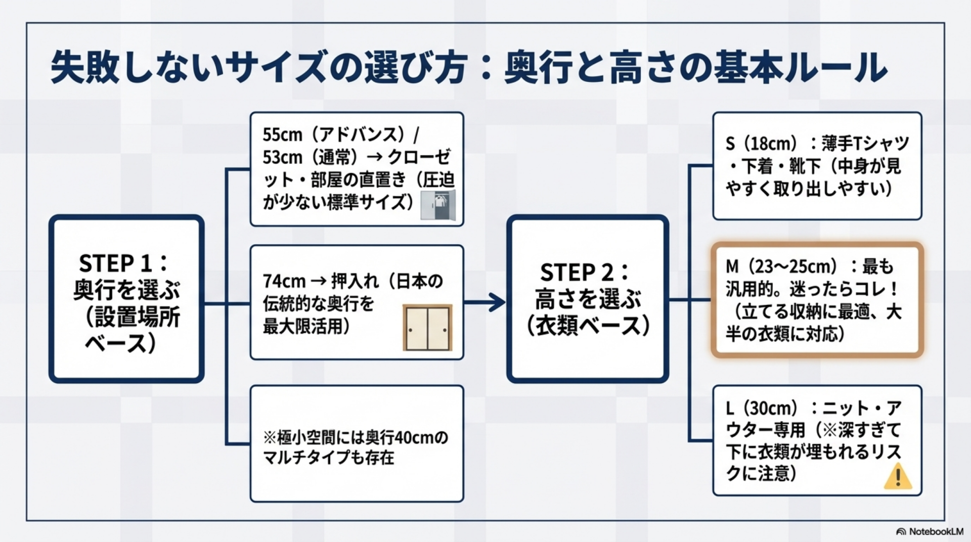 💡 迷ったらM(23〜25cm)が安全です。薄手の衣類も立てて収納すれば無駄なく使えますし、ニット類も2〜3枚程度なら問題なく収まります。深すぎるL(30cm)は、下に入れた衣類が見えなくなり「存在を忘れる」リスクがあるので、必要な場合のみ選ぶのがおすすめです。