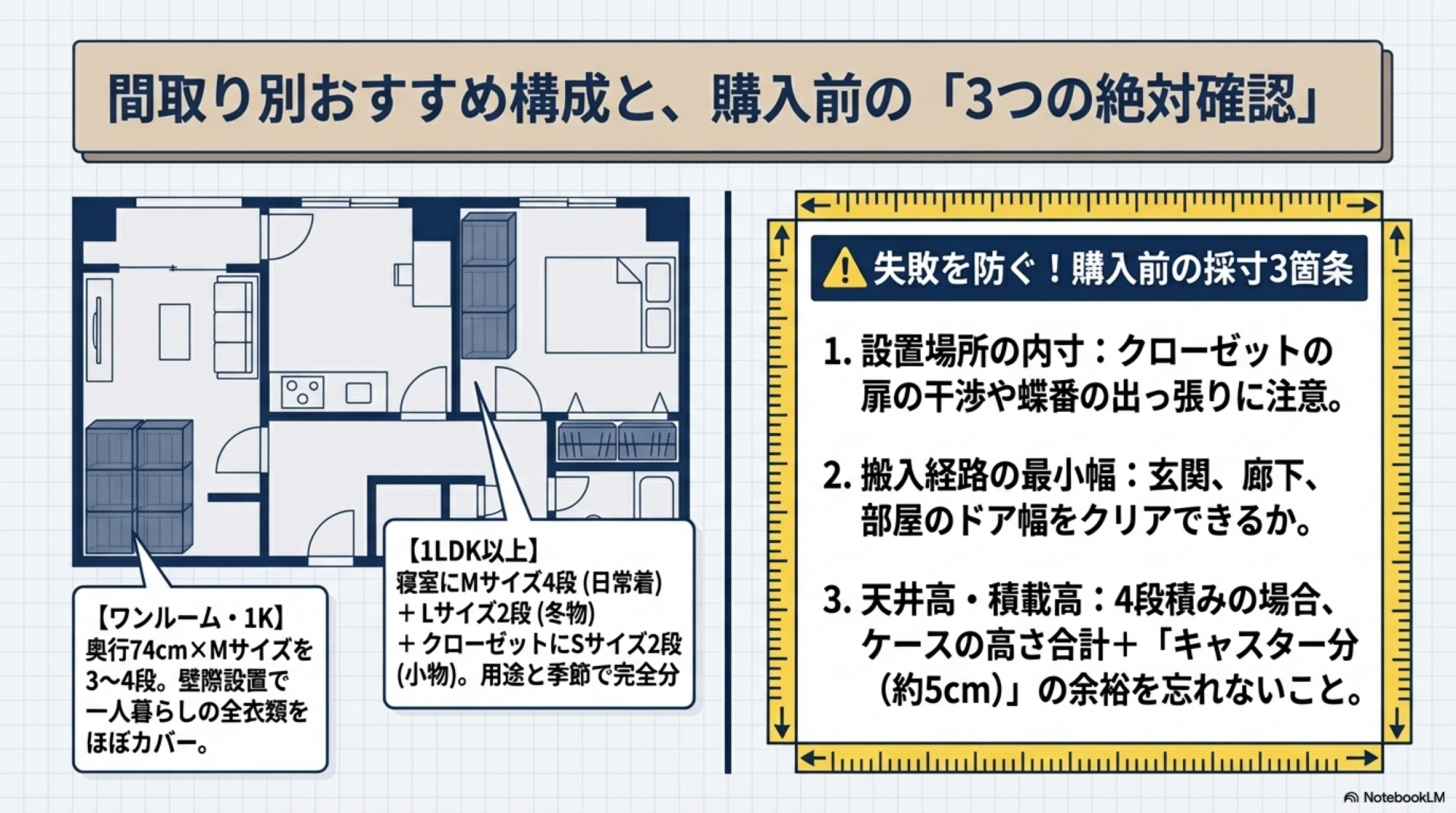 フィッツケースはサイズ展開が非常に豊富なため、「どのサイズを選べばいいか分からない」という声をよく聞きます。ここでは、選び方の基本から間取り別のおすすめ構成まで解説します。