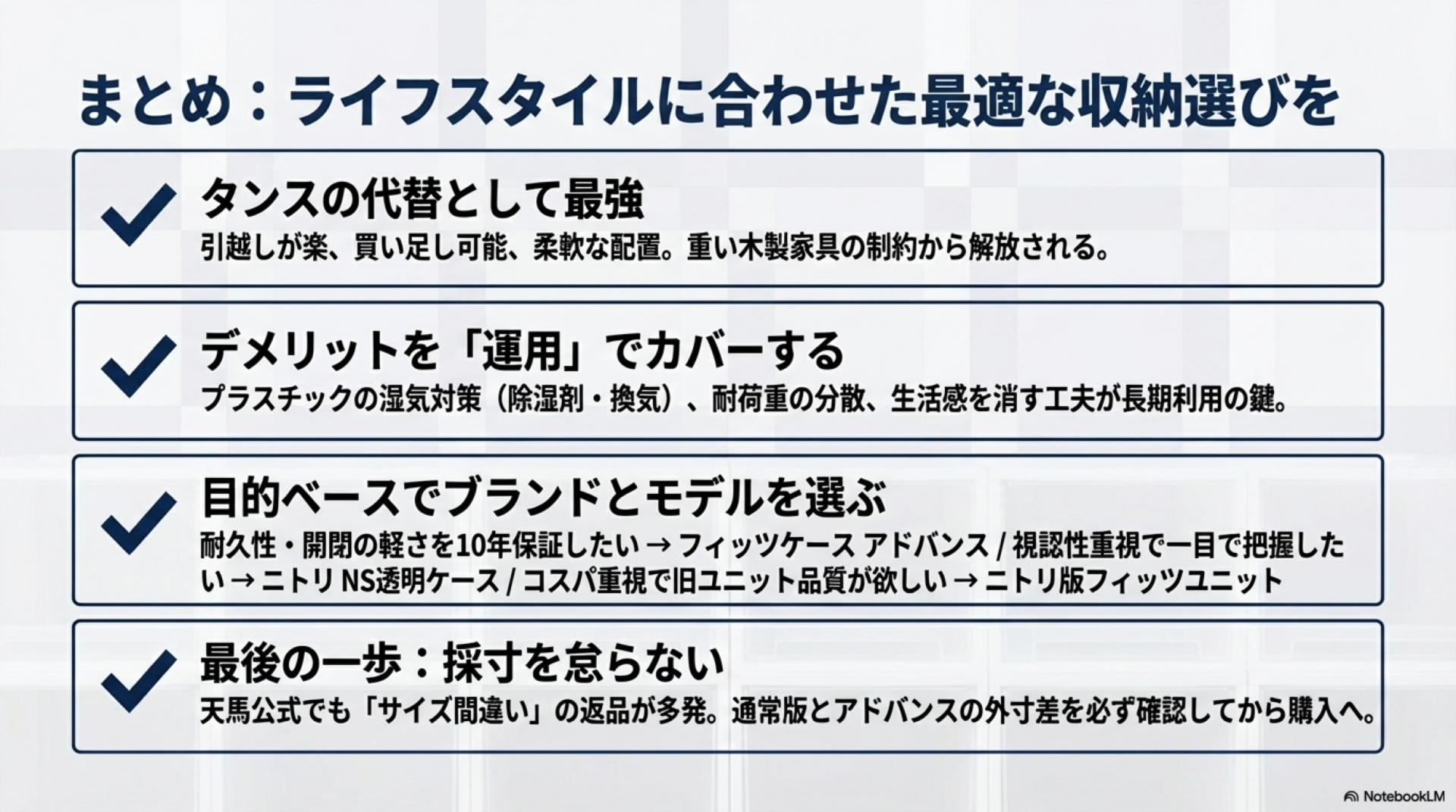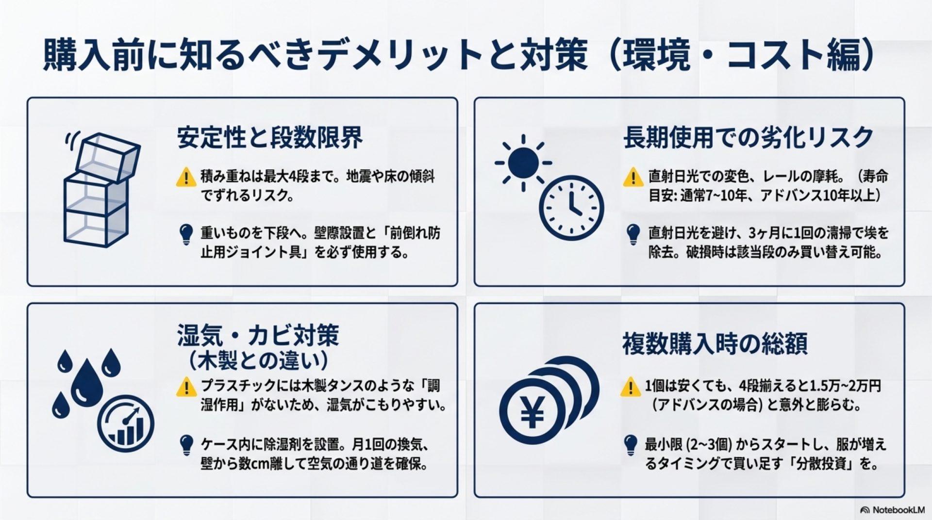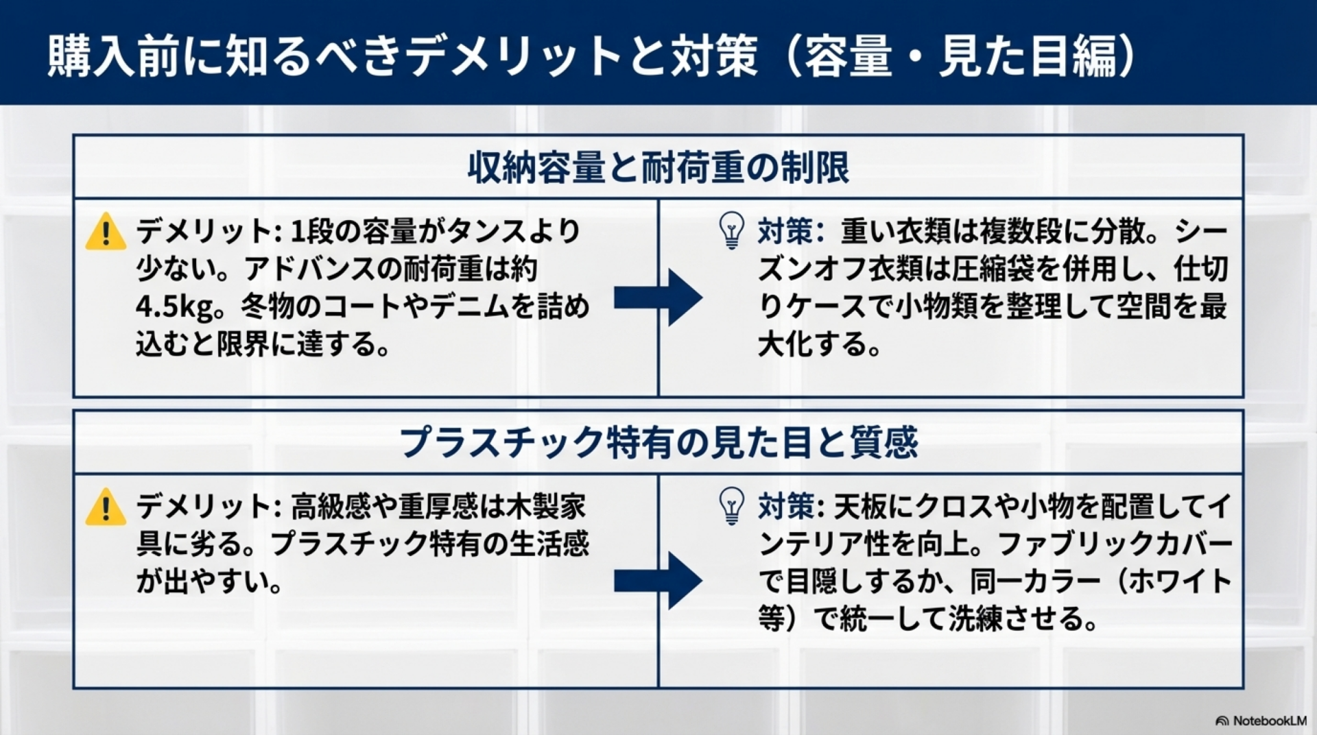 一方で、収納容量の制限、プラスチック特有の質感、湿気対策の必要性といったデメリットもあります。これらを理解した上で、自身の生活スタイルに合うかどうかを判断してください。