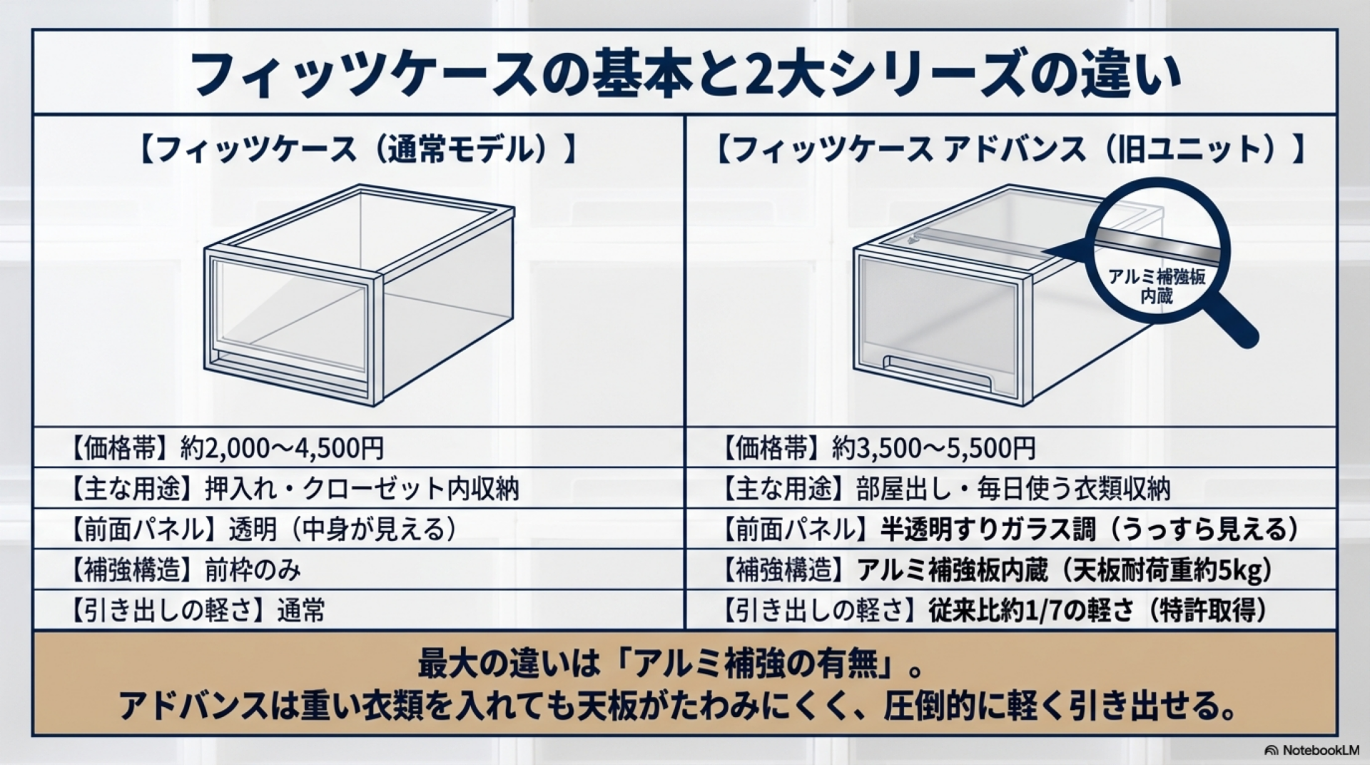 フィッツシリーズには複数のラインナップがありますが、衣装ケースとして代表的なのはフィッツケース(通常モデル)と、上位モデルのフィッツケース アドバンス(旧名:フィッツユニットケース)の2つです。