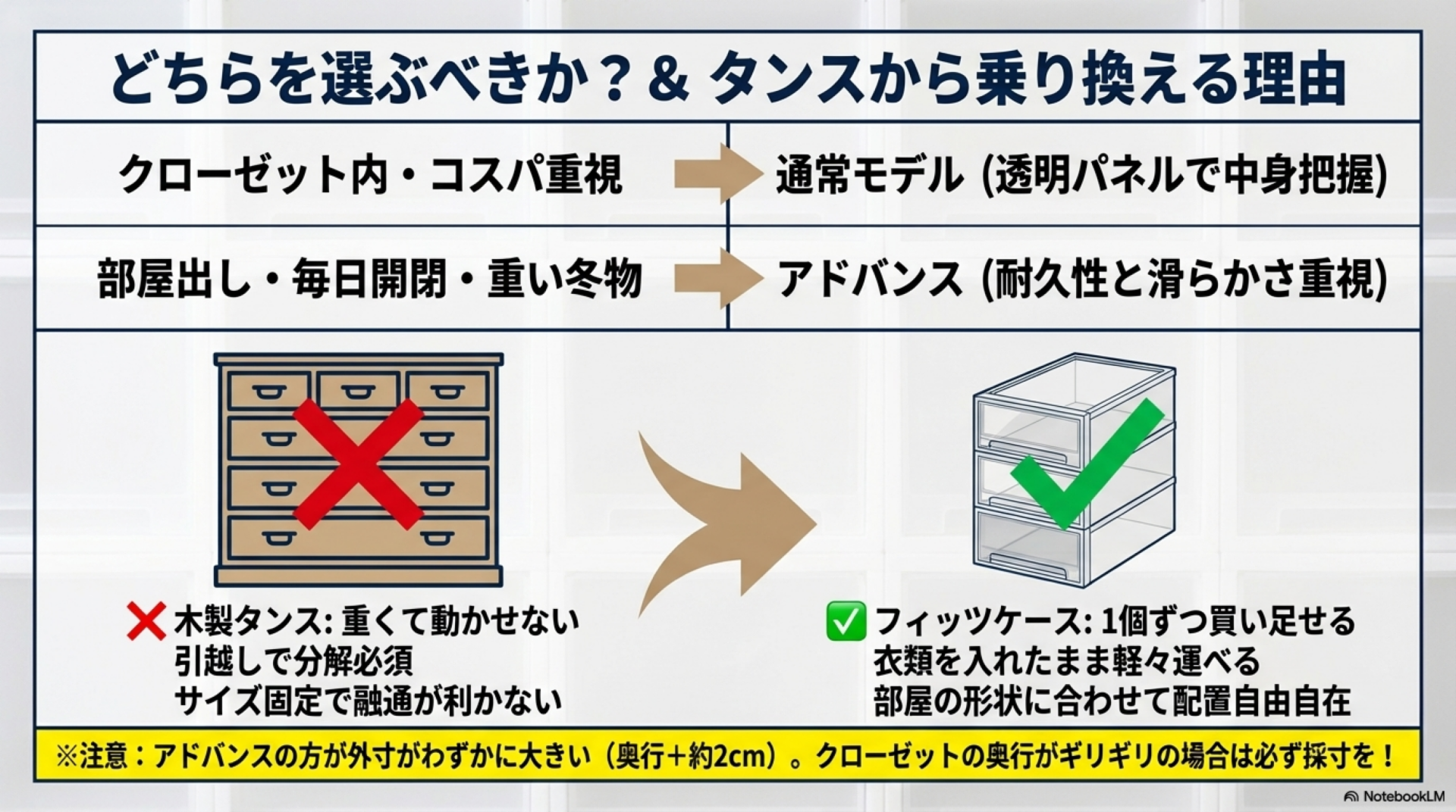 クローゼットや押入れの中に入れるだけならフィッツケースで十分です。部屋に出して毎日開閉する場合や、重い冬物衣類が多い場合は、アルミ補強と特許取得の開閉機構を持つアドバンスがおすすめです。