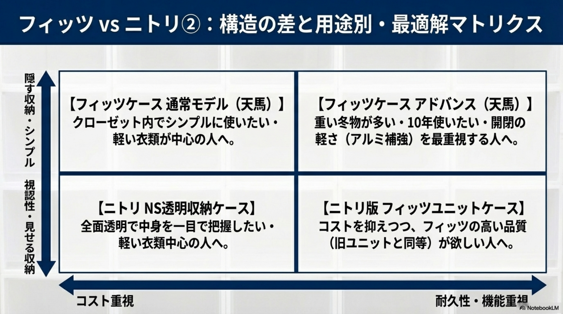ニトリとの比較では、コスト重視ならニトリ版フィッツユニットケース、耐久性と機能重視ならフィッツケース アドバンス、中身の視認性重視ならニトリNS透明ケースが適しています。どれを選ぶかは「何を重視するか」で決まりますので、この記事の比較情報を参考に、自分の優先順位に合った製品を選んでください。
