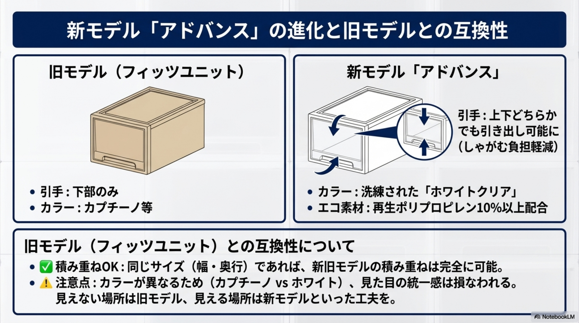 すでにニトリ版のフィッツユニットケースを使っている方がアドバンスを買い足す場合、サイズの互換性があるため積み重ねて使用可能です。ただしカラーが異なる(カプチーノ vs ホワイト)ため、見た目の統一感は損なわれます。