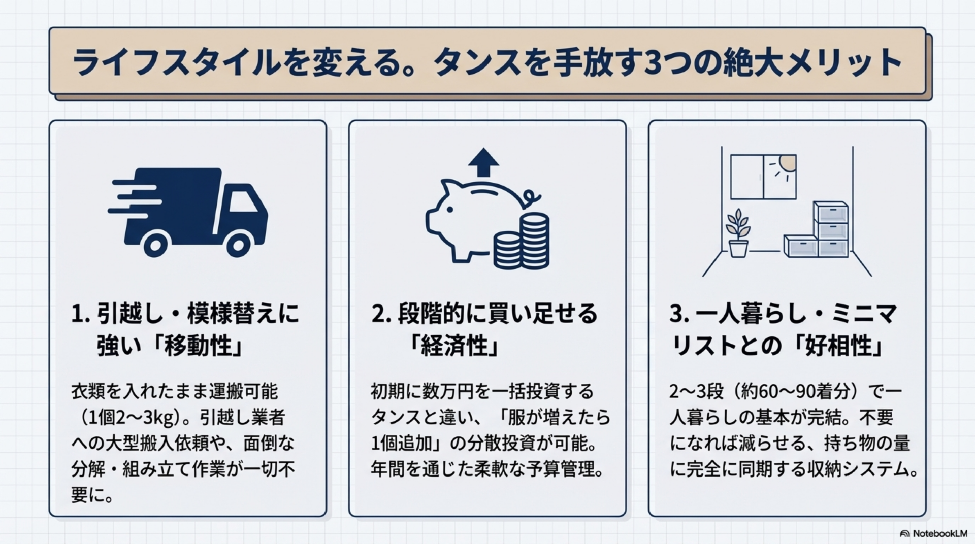 従来の木製タンスは「重くて動かせない」「引越しのたびに分解が必要」「サイズが固定で融通が利かない」という弱点があります。