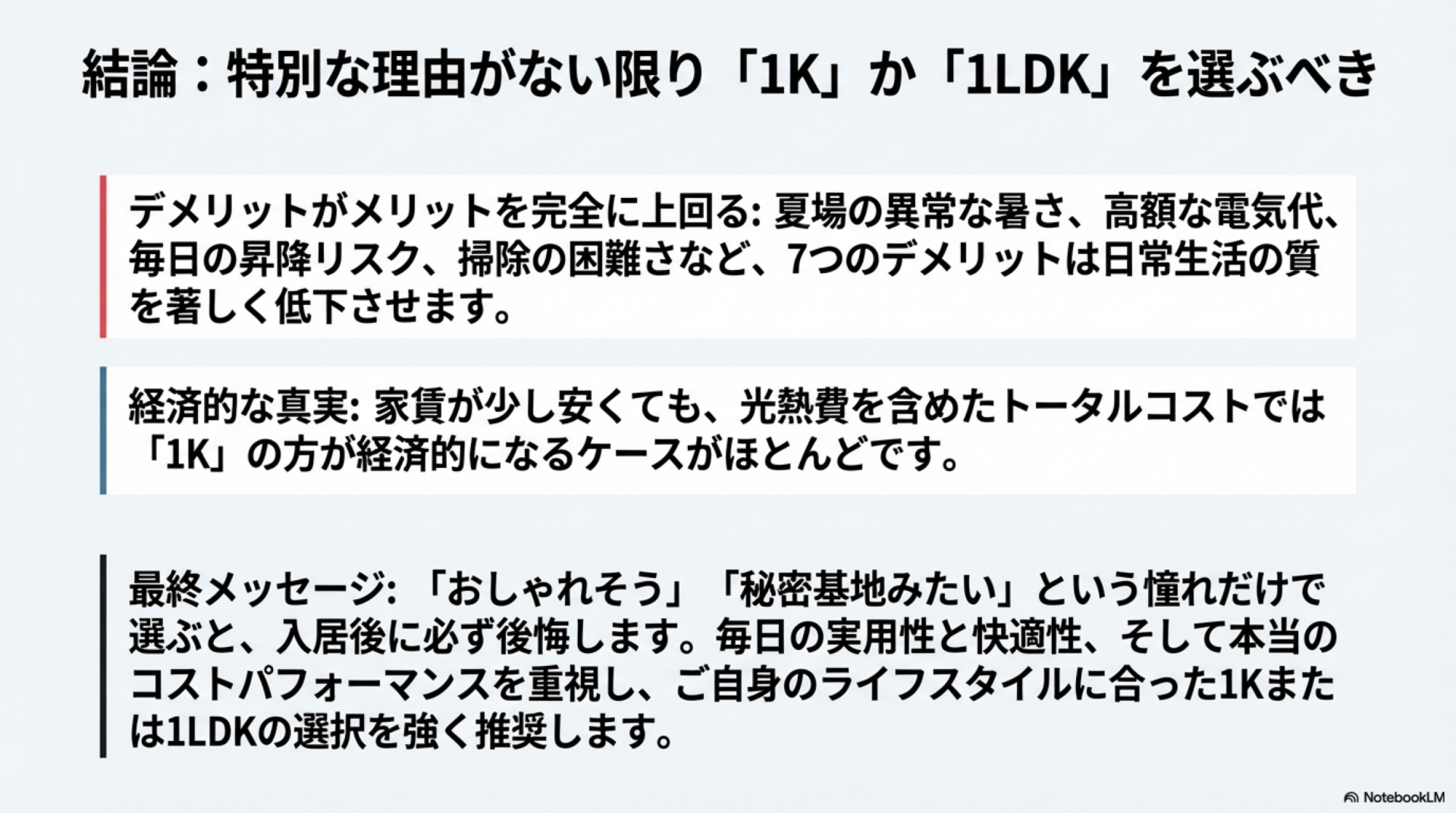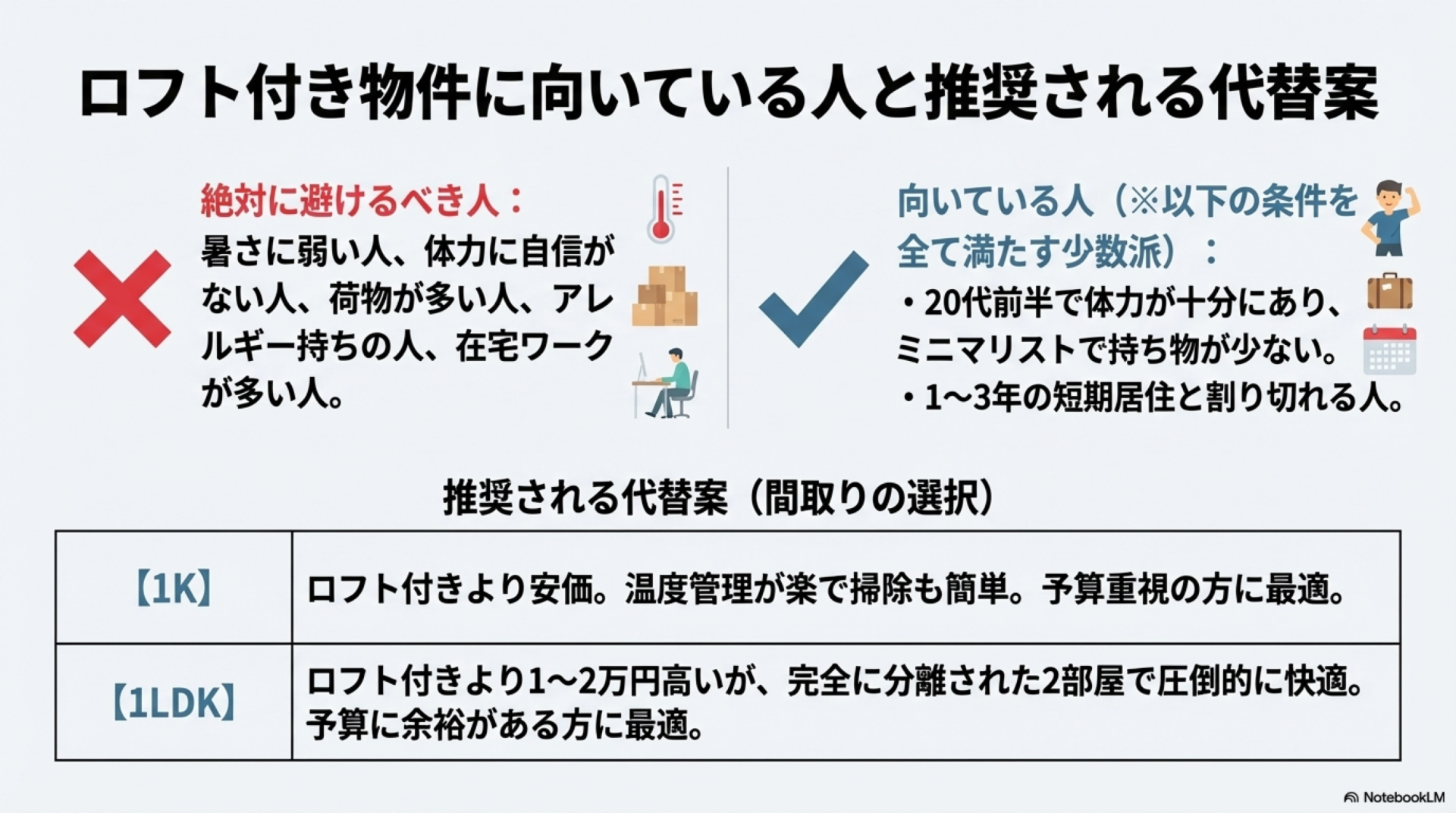 どうしても選ぶ場合は、20代前半で体力があり、短期居住(1〜3年)予定で、暑さに強く、荷物が少ないという条件をクリアしていることが前提です。実用性と快適性を重視するなら、ロフト付き物件は避けて、自分の予算に合った1Kまたは1LDKを選びましょう。