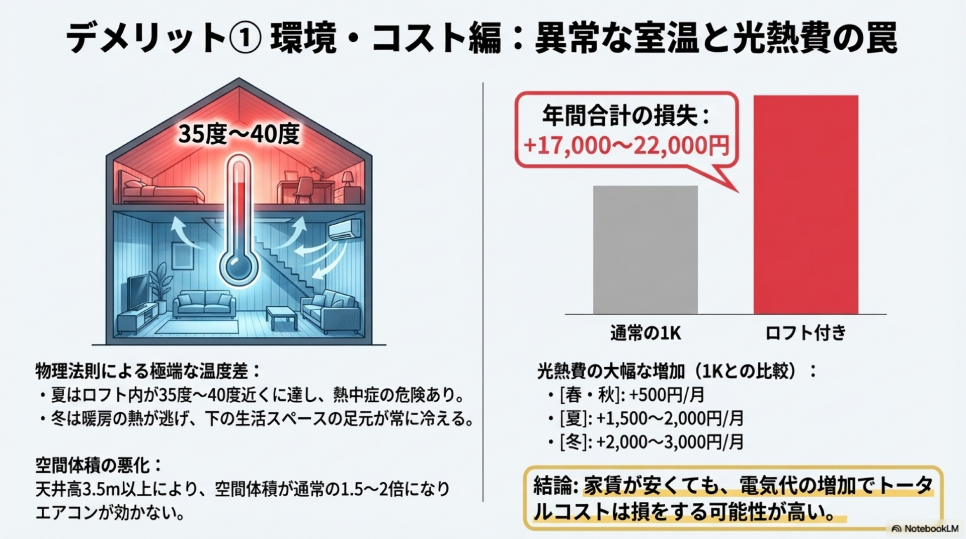 快適な部屋の温度と湿度管理のページで適切な室温の目安を解説していますが、ロフト付き物件ではその目安を維持すること自体が構造的に困難です。