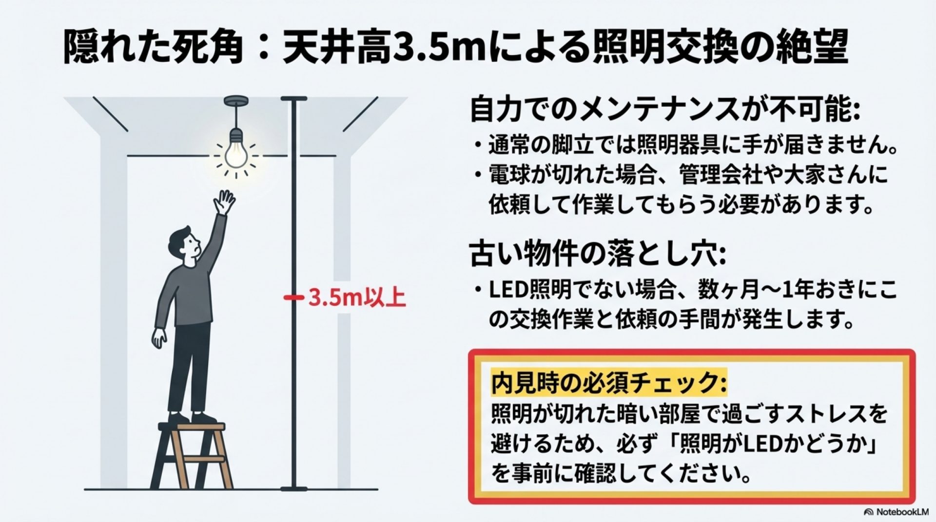 - 照明の種類(LEDかどうか。天井が高いため自力交換が困難)